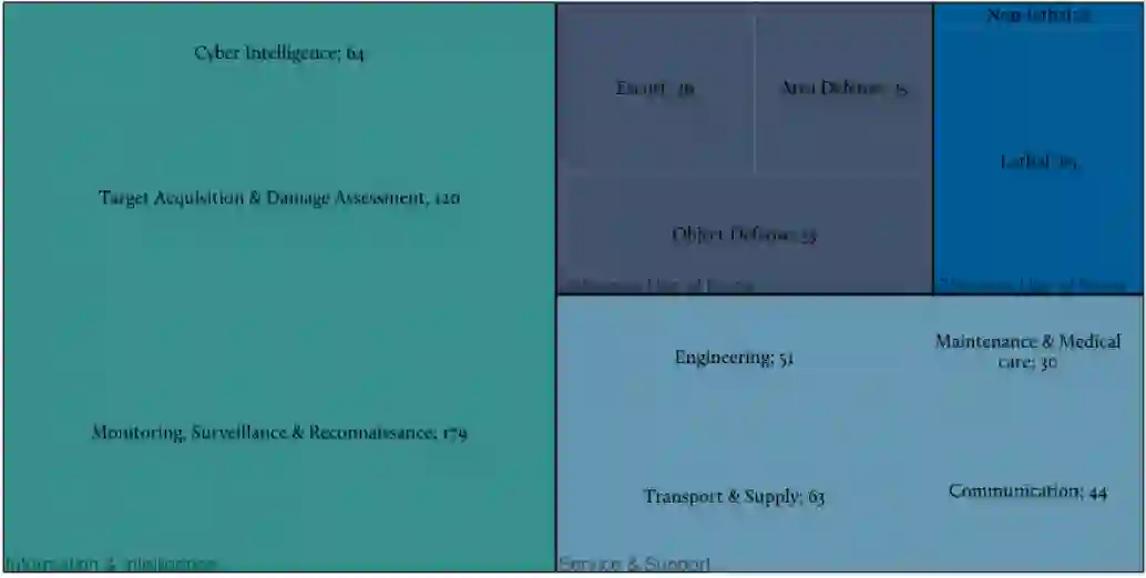 使用HCSS的军事功能分类法,对当前的RAS进行了事实性的概述(见图1)。本节将首先展示该分类法的第一层;然后是第二层,对RAS的潜在军事应用进行更详细的说明。为了提供一个清晰的关于RAS生产和使用的广泛观点,可视化将显示每个国家生产/使用的项目的大致数量。