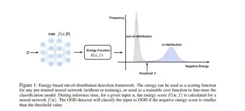 确定输入是否在分布外(OOD)是在开放世界中安全部署机器学习模型的一个重要基石。然而,以往依赖softmax置信评分的方法对OOD数据存在过自信的后验分布。我们提出了一个使用能量分数的OOD检测的统一框架。我们表明,能量分数比使用softmax分数的传统方法更好地区分分布内和分布外的样本。与softmax信心分数不同,能量分数理论上与输入的概率密度一致,不太容易受到过度自信问题的影响。在这个框架内,能量可以被灵活地用作任何预训练的神经分类器的评分函数,也可以作为可训练的代价函数来明确地塑造能量表面,用于OOD检测。在CIFAR-10预训练的WideResNet中,使用能量分数比softmax信心分数降低平均FPR (TPR 95%) 18.03%。在以能量为基础的训练中,我们的方法在一般的基准上比最先进的方法表现得更好。