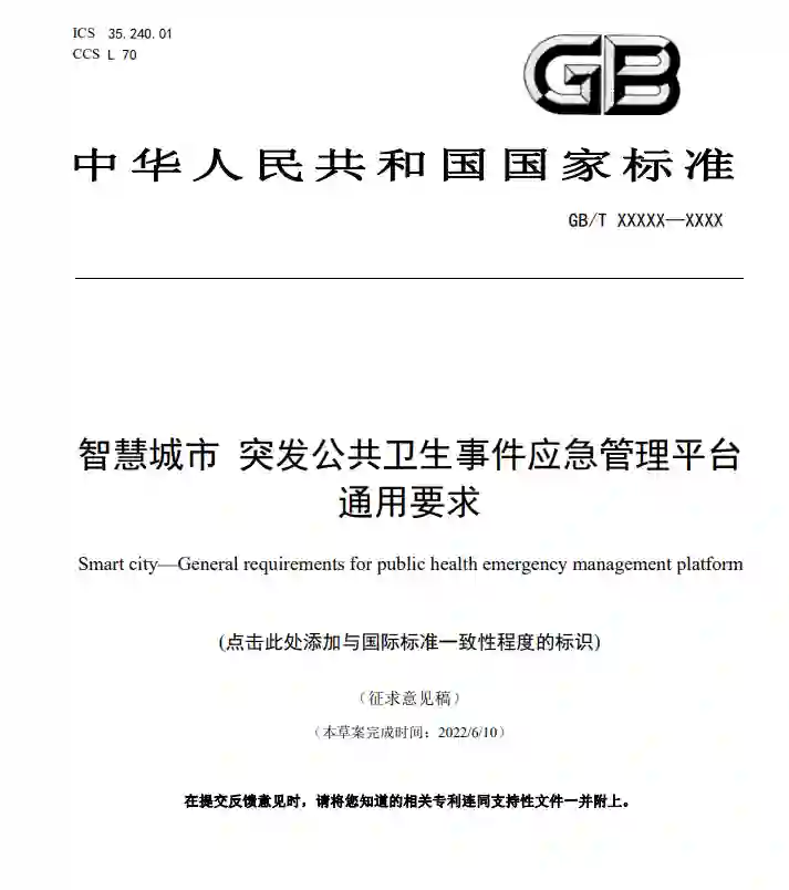 《智慧城市突发公共卫生事件应急管理平台通用要求》国家标准意见稿,本文件本文件确立了突发公共卫生事件应急管理平台的基本功能框架,并规定了平台数据支撑、服务、接口、运维和安全等通用要求。 本文件适用于指导突发公共卫生事件应急管理平台的建设、运营和管理。