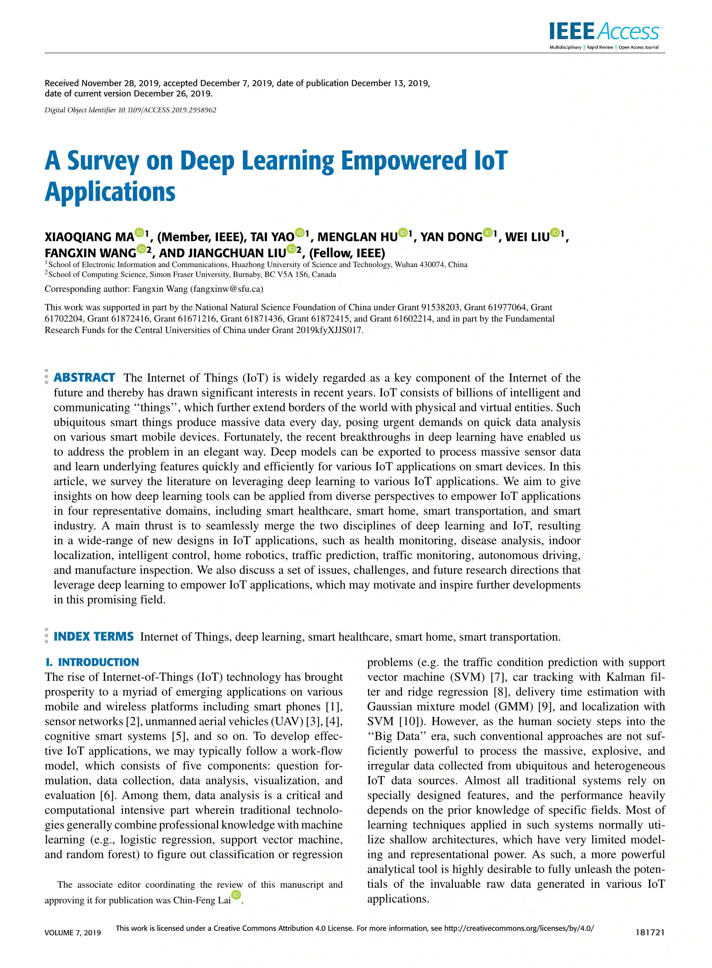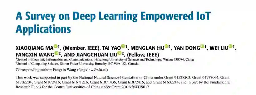 简介: 物联网(IoT)被广泛认为是未来Internet的关键组成部分,因此近年来引起了极大的兴趣。物联网由数十亿个智能且可通信的“事物”组成,这些事物进一步通过物联网虚拟世界扩展了边界世界。这种无处不在的智能事物每天都会产生大量数据,因此迫切需要对各种智能移动设备进行快速数据分析。幸运的是,深度学习领域的最新突破使我们能够以优雅的方式解决问题。可以导出深度模型来处理大量传感器数据,并快速有效地了解智能设备上各种IoT应用程序的基础功能。在本文中,我们调查了有关将深度学习用于各种物联网应用的文献。我们旨在就如何从多种角度应用深度学习工具以在四个代表性领域(包括智能医疗保健,智能家居,智能交通和智能产业)中增强物联网应用程序的功能提供见解。主要目标是将深度学习和物联网这两个学科无缝地融合在一起,从而在物联网应用中产生了各种各样的新设计,例如健康监测,疾病分析,室内定位,智能控制,家用机器人技术,交通预测,交通监视,自动驾驶和制造检查。我们还将讨论一系列问题,挑战和未来的研究方向,这些问题将利用深度学习来为物联网应用程序提供支持,这可能会激发并激发这一有前途的领域的进一步发展。