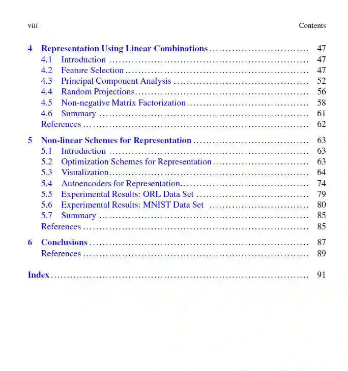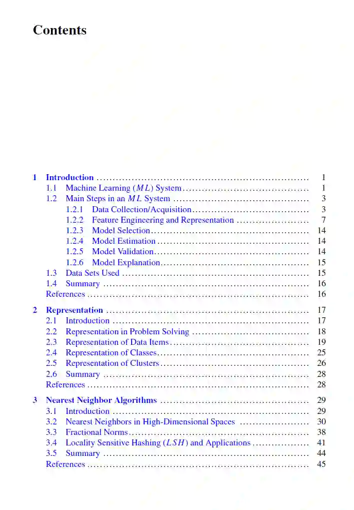 本书为表示提供了简明而全面的指南,这是机器学习(ML)的核心。最先进的实际应用涉及许多高维数据分析的挑战。不幸的是,许多流行的机器学习算法在面对庞大的基础数据时,在理论和实践中都无法执行。本书恰当地介绍了这个问题的解决方案。 此外,这本书涵盖了广泛的表示技术,对学者和ML从业者都很重要,如局部敏感哈希(LSH),距离度量和分数范数,主成分(PCs),随机投影和自动编码器。书中提供了几个实验结果来证明所讨论技术的有效性。 本书讨论了机器学习(ML)中最重要的表示问题。在使用机器从数据中学习类/聚类抽象时,以适合有效和高效机器学习的形式表示数据是很重要的。在本书中,我们建议涵盖各种在理论和实践中都很重要的表示技术。在当前兴趣的实际应用中,数据通常是高维的。这些应用包括图像分类、信息检索、人工智能中的问题解决、生物和化学结构分析以及社会网络分析。这种高维数据分析的一个主要问题是,大多数流行的工具,如k近邻分类器、决策树分类器,以及一些依赖于模式间距离计算的聚类算法都不能很好地工作。因此,在低维空间中表示数据是不可避免的。 常用的降维技术有以下几种: