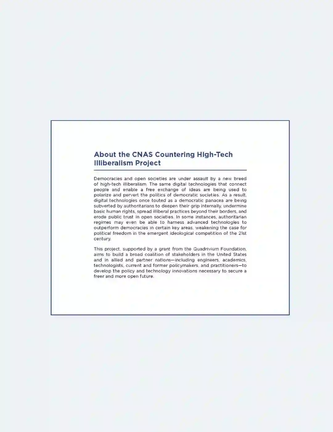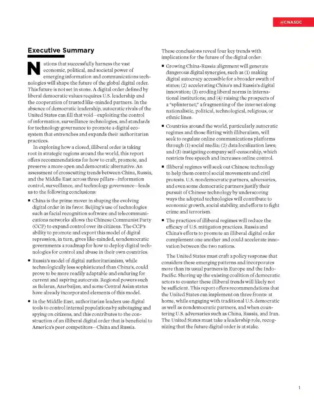 2021年11月17日,美国国家安全政策智库新美国安全中心(CNAS)发布《数字秩序的未来》报告[1],鼓吹所谓“民主同盟”和“自由数据技术”,攻击中国、俄罗斯和中东在数据技术方面的成功事实和做法。报告认为成功利用新兴信息和通信技术的巨大经济、政治和社会力量的国家将会塑造全球数字秩序的未来,并就如何制定、促进和维护一个更加开放和民主的数据政策提出了建议。报告从信息控制、监视和技术治理三个方面分析中国、俄罗斯和中东的数据政策,指出:①中国已经成为塑造全球数字秩序的主要推动者;②俄罗斯现有的数据秩序模式可能更容易适应西方的数字管理体系,并具备持久性;③在中东,政府使用数字工具监视公民。 报告提出了美国应采取的对策:①建立所谓“民主行动者联盟”,将包括欧洲和印太等地区的伙伴国家纳入联盟,以对抗所谓“非自由主义趋势”;②在国内,同时与美国传统的民主和非民主群体接触;③颁布美国国家数据保护和隐私保护法,并在国外尽可能采取长臂管辖;④美国政府相关部门应与科技公司就非民主政府在有业务往来的国家开展业务的风险定期进行正式磋商;⑤美国政府需要优先考虑支持对隐私保护技术解决方案的研究和开发。