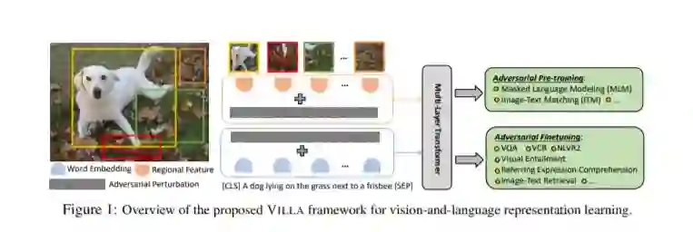 我们提出了VILLA,这是已知的第一个针对视觉和语言(V+L)表征学习的大规模对抗训练。VILLA由两个训练阶段组成: (一)任务不可知的对抗性预训练; 其次(二)针对具体任务进行对抗性微调。为了避免在图像像素和文本标记上增加对抗性扰动,我们建议在每个模态的嵌入空间中进行对抗性训练。为了实现大规模训练,我们采用了“free”对抗式训练策略,并与基于KL发散的正则化相结合,提高了嵌入空间的高不变性。我们将VILLA应用到目前表现最好的V+L模型中,并在广泛的任务中达到了新的水平,包括视觉问题回答、视觉常识推理、图像-文本检索、参考表达理解、视觉隐含和NLVR2。