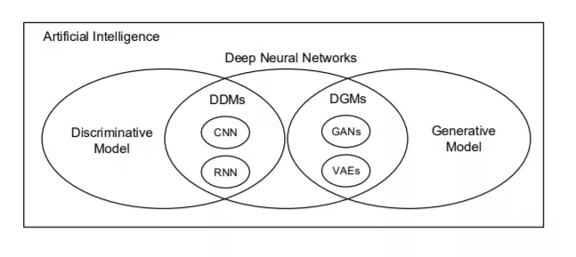 在过去的几年里,计算能力的提高使得深度神经网络在各种应用中取得了成功。在这一类别中,有两类深度学习模型:生成型和判别型。生成模型拟合我们可以在我们的世界中观察到的数据,比如貌似真实的人脸照片[1]。总的来说,这些被称为深度生成模型(DGMs)。另一种是将观察到的数据分成不同的类,如人脸识别、推荐系统等[2]。这类模型被称为深度判别模型(DDMs)[3]。最流行的DGM是生成对抗网络(GANs)[4]和变分自动编码器(VAEs)[5]。两者都广泛用于生成真实的照片[6],合成视频[7],翻译一个图像到另一个[8],等等。与传统DDMs一样,递归神经网络(RNN)[9]、卷积神经网络(CNN)[10]及其变体在情绪分析[11]、图像识别[12]、自然语言处理[13]、[14]等方面表现良好。AI景观关系图如图1所示。