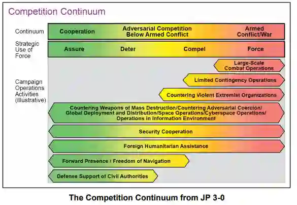 要在这一充满竞争的环境中取得成功,就必须加强与联合部队的整合与同步。因此,对 AFDP 3-0 进行了调整,将竞争的连续性描述为空中行动的全球背景,并说明美国空军的核心职能如何在该军种独特能力的支持下指导空中力量的应用。此外,AFDP 3-0 还讨论了美国空军将如何指挥、组建和展示战斗准备部队,包括空军部队组建(AFFORGEN)模式、战斗联队和敏捷战斗部署(ACE)概念。这些主题结合了空军的联合职能和信条,以其他军种可识别和熟悉的语言传达美国空军的条令。