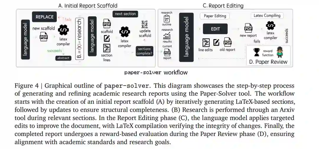 一旦框架构建完成,paper-solver使用专门的命令迭代优化生成的论文。主要的命令是EDIT,该命令允许对LaTeX代码进行逐行修改,确保内容与研究计划一致,论证清晰,并符合格式标准。在集成编辑之前,系统会编译LaTeX以验证无错误功能,从而保持文档的完整性。