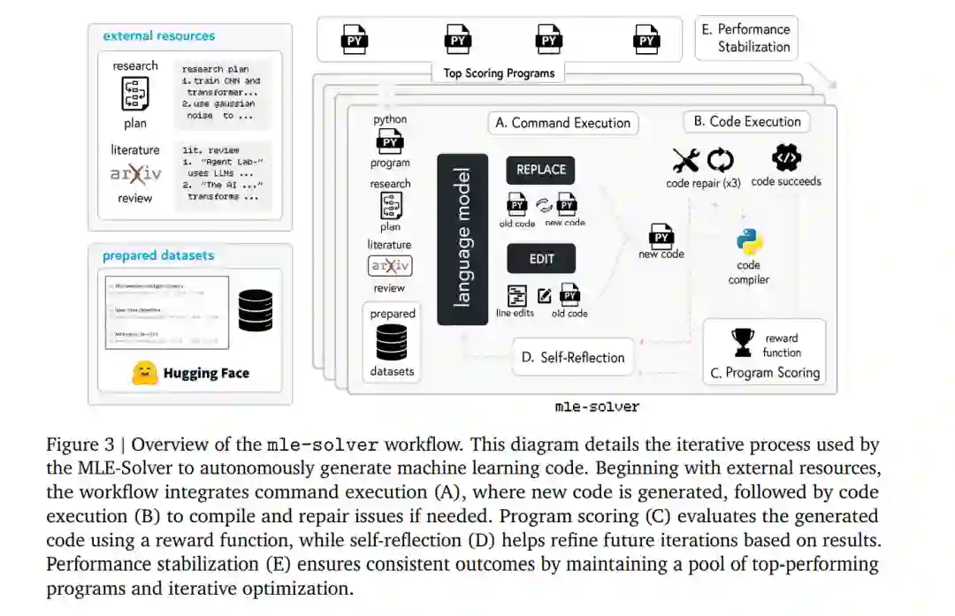 在运行实验阶段,ML Engineer智能体专注于实施和执行先前制定的实验计划。这一过程由mle-solver模块支持,该模块能够自主生成、测试和优化机器学习代码。mle-solver首先基于研究计划和文献综述的见解生成初始代码。在第一个mle-solver步骤中,程序为空,必须从头生成一个文件,该文件将作为最高得分的程序。mle-solver的工作流程如下: