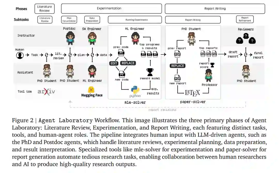 Agent Laboratory 的总体工作流程包括三个主要阶段:文献综述、实验和报告撰写。每个阶段都有专门的智能体负责执行相应的任务。如图2所示,整个流程集成了人类输入和LLM驱动的智能体,如PhD智能体和Postdoc智能体,它们负责文献综述、实验规划、数据准备和结果解释。此外,专门的工具如mle-solver(用于实验)和paper-solver(用于报告生成)自动化了繁琐的研究任务,使得人类研究人员与AI能够协作生成高质量的研究成果。