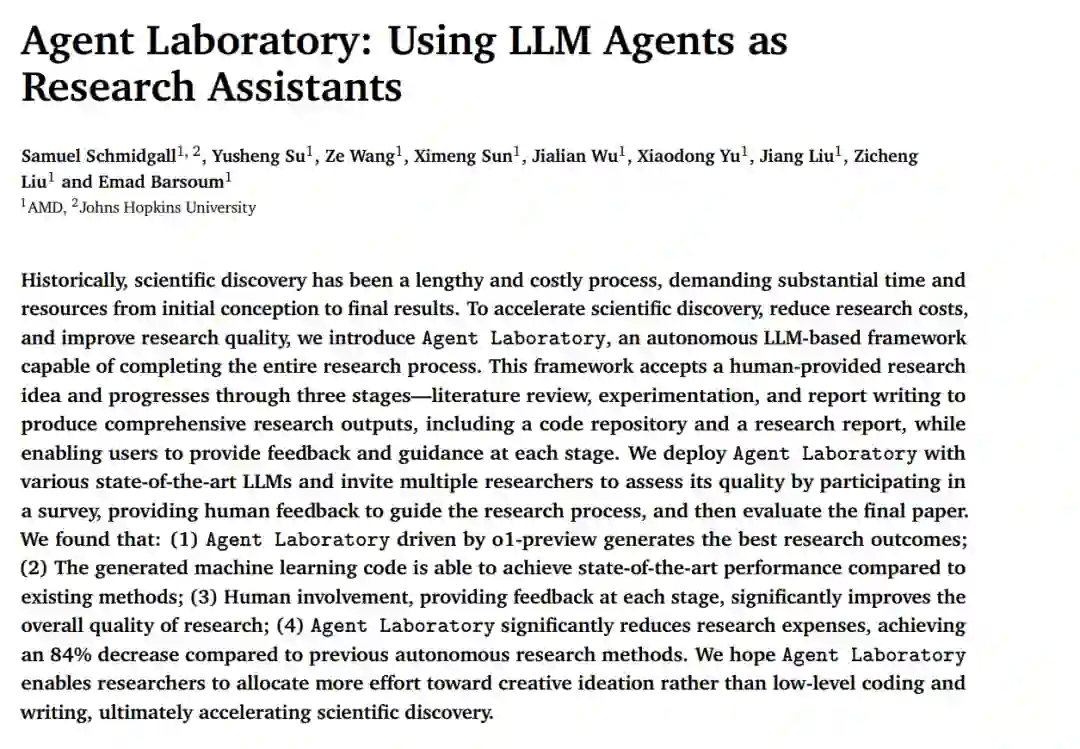 Agent Laboratory 是一个基于LLM智能体的自主研究框架,旨在加速机器学习研究。通过集成人类反馈和自动化工具,Agent Laboratory 能够显著降低研究成本,提高研究质量。我们希望通过这一工具,研究人员能够将更多精力集中在创造性构思和实验设计上,从而加速科学发现的进程。