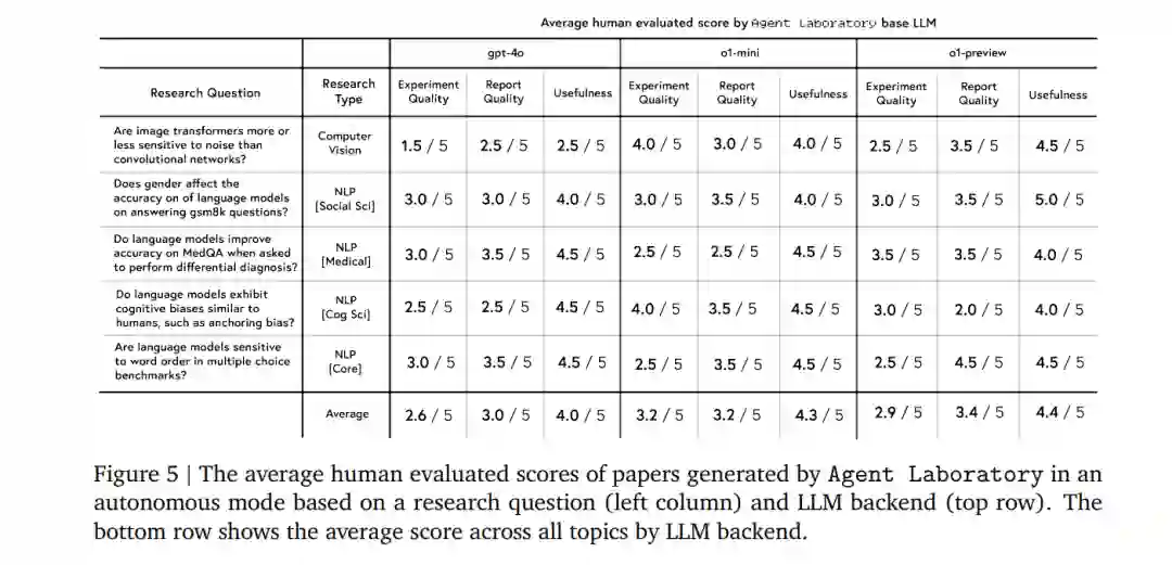 我们首先评估了Agent Laboratory在自主模式下生成的论文的质量。我们邀请了10位志愿者PhD学生,每人随机评审3篇论文,评估实验质量、报告质量和有用性。结果显示,不同LLM后端的表现存在显著差异。o1-preview在有用性和报告质量方面表现最佳,而o1-mini在实验质量方面表现最好。gpt-4o在所有指标上均落后于其他模型。