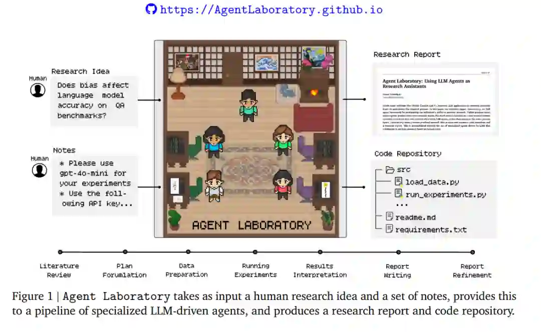 科学家常常面临限制,限制了他们在任何给定时间可以探索的研究思路数量,从而导致研究思路根据预测的影响力进行优先排序。虽然这一过程有助于确定哪些概念值得投入时间,以及如何有效地分配有限的资源,但许多高质量的研究思路仍未得到探索。如果探索研究思路的过程能够减少这些限制,研究人员就能同时探索多个概念,从而增加科学发现的可能性。 为实现这一目标,近期的研究探讨了大语言模型(LLM)在研究构思和自动化论文生成方面的能力,其中LLM智能体扮演了人类科学家的角色(Baek et al. (2024); Ghafarollahi & Buehler (2024b); Lu et al. (2024a); Swanson et al. (2024))。Baek et al. (2024)的研究介绍了ResearchAgent,该系统自动生成研究思路、方法和实验设计,并通过多个模拟同行讨论的评审智能体的反馈迭代地改进这些思路,利用与人类对齐的评估标准来提升输出的质量。Lu et al. (2024a)则探讨了完全自动化的论文生成,AI Scientist框架能够生成新的研究思路、编写代码、进行实验,并创建完整的科学论文,同时通过自动化同行评审系统评估研究成果。尽管这些工作展示了当前的LLM能够生成被认为比人类专家提出的思路更具创新性的研究思路,但Si et al. (2024)指出,LLM在可行性和实施细节上仍然存在不足,表明LLM在研究中的作用应当是补充性的,而非替代性的。因此,我们的目标是设计一个自主智能体流水线,帮助人类实现自己的研究思路。 在本工作中,我们介绍了智能体实验室(Agent Laboratory),一个加速个人进行机器学习研究的自主流水线。与以往的研究方法不同,在这些方法中,智能体独立进行研究构思,不依赖于人类输入(Baek et al. (2024); Lu et al. (2024b)),智能体实验室旨在通过语言智能体帮助人类科学家执行他们自己的研究思路。智能体实验室接受人工提供的研究思路作为输入,输出由自主语言智能体生成的研究报告和代码库,并允许根据用户偏好在每个阶段提供不同程度的人工参与与反馈。我们的贡献包括以下几点: