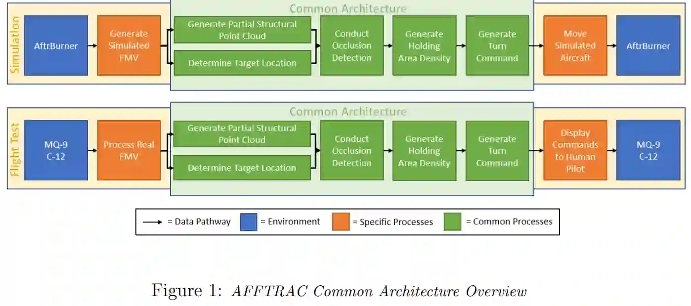 RPA ISR 行动的一个限制因素是,如果指挥链路被切断,就会失去目标轨迹。RPA 要在没有指挥链路的情况下有效执行 ISR 任务,就需要具备自主 F2T 目标的能力。自动查找、固定和跟踪 (AFFTRAC) 就是为帮助解决这一问题而开发的。虽然算法组件并不新颖,但创建并集成到概念验证战术自动驾驶仪中却很新颖。单目立体视觉用于处理轨道期间获取的连续图像,以生成原始结构的部分结构点云。然后,利用该部分结构点云生成飞机停留区域的密度。一种简单的贪婪算法利用这一滞留区域密度生成飞机转弯指令,以近似于战术 ISR 滞留。其结果是,现有 MQ-9 传感器的图像被用来提供指令引导,以自主保持对目标的视线。