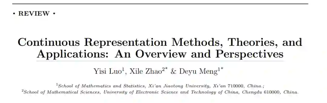 在大数据时代,从不完整测量、噪声观测或物理规则与属性中重建高质量数据仍是多个领域中的基本挑战 [37, 64, 103, 122],例如医学成像重建 [111]、卫星遥感 [63]、图形学中的场景重建 [131],以及数值科学计算 [80]。传统的数据重建方法通常依赖于基于离散网格的表示(如向量、矩阵或高阶张量 [83])和手工设计的先验知识(如稀疏性或低秩性 [185]),这类方法在刻画复杂现实世界数据的内在几何或拓扑结构方面往往存在局限。尤其在处理如任意分辨率成像 [20]、三维医学图像配准 [11]、图形重建 [131]、雷达成像几何 [26]、不规则空间转录组数据 [28]等不规则采样、模态异质或跨分辨率任务时,这些问题更加突出。 为应对上述挑战,连续表示方法(参考经典工作 [20,103,105,110,134,157])作为一种变革性范式,正在广泛应用于通用数据重建问题中。连续表示指的是:利用连续函数表示来建模离散数据,通过参数模型(如基函数或深度神经网络)将位置坐标(例如空间位置、时间索引或视角方向)映射到对应的响应值(如图像像素、物理场或体积强度)。 为了增强连续表示的有效性,可以通过引入隐式或显式结构约束对表示函数进行正则化,例如损失函数中的微分算子 [10] 或函数分解 [103]。将离散数据嵌入到这样一种平滑、分辨率无关的连续空间后,这些方法具备诸多优势,包括全局特征建模、对不规则多维数据的适应性、分辨率无关性以及可解释的学习理论等。例如,隐式神经表示(INRs) [20, 134, 142] 通过神经网络将信号参数化为连续函数,从而实现无缝插值与超分辨率;张量函数分解框架 [42,103] 通过多元函数的低秩因式分解挖掘高维数据的多线性结构;统计型连续表示方法 [17,40,42] 编码了时间连续域中的相关性,适用于流数据或时间序列分析。 这类连续方法天然避免了离散化误差,具备高度参数效率——离散数据可以由参数量远少于原始数据规模的模型所表示。这一特性在大规模数据任务中尤为重要,例如 5D 地震数据插值 [48] 或视频时空超分辨率 [22]。此外,连续表示还易于整合领域先验知识,如:在全波形反演中引入物理约束 [35],或在磁共振成像(MRI)中引入准静态运动先验 [159],从而弥合通用模型与应用需求之间的鸿沟。总之,连续表示方法正日益成为多类数据重建任务中的有效研究范式。 尽管进展迅速,该领域仍存在明显的碎片化现象。现有研究往往聚焦于某一特定方向,如:通用方法设计(如函数的切比雪夫展开 [60]、傅里叶特征 INRs [142]、小波 INRs [129])、理论分析(如神经切线核理论 [2, 72, 142] 或隐式正则化视角下的收敛性研究 [58, 103]),或某些具体应用(如连续高光谱成像 [14]、可变形配准 [11]、偏微分方程的函数分解求解 [146]),而缺乏对它们之间交叉关联的系统整合。事实上,这种交叉联系对于加深理解与推进创新至关重要。 例如,广泛研究的基于 INR 的任意尺度图像超分辨率 [20],其训练范式与神经算子方法 [84,96] 本质相似——两者均以低维输入(坐标或潜在变量)生成高分辨率输出。又如,用于三维场景重建的张量辐射场 [13],在科学计算中本质上与张量函数分解方法 [51,60,103,137] 存在内在联系。再如,经典的傅里叶基函数表示 [80] 与近年来融合傅里叶基的神经表示方法 [142] 在原理上也具有一致性。