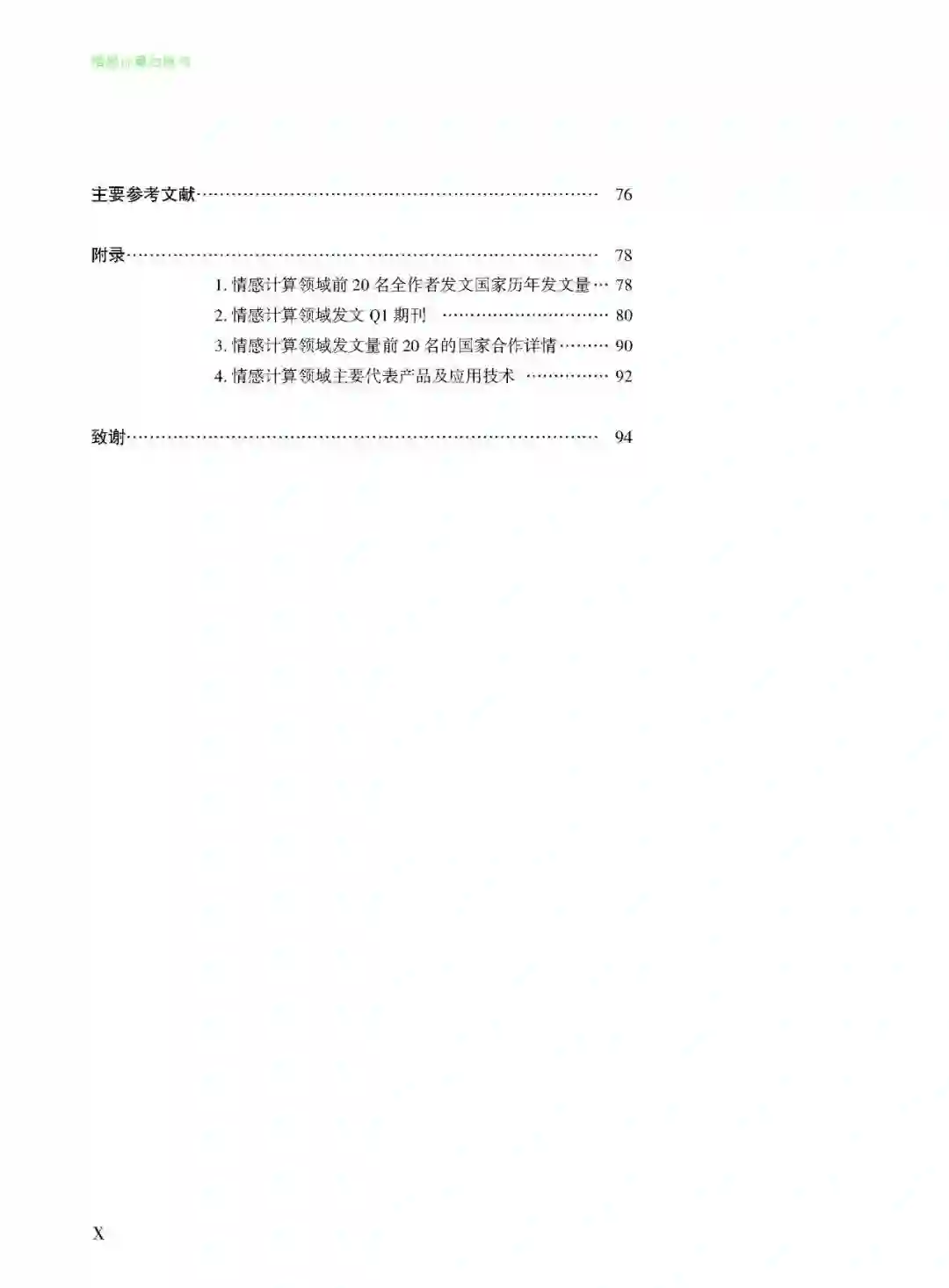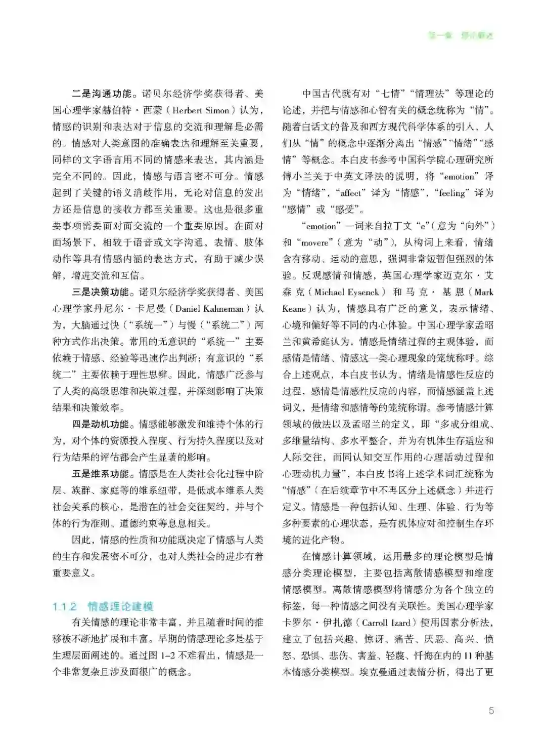 情感计算(Affective Computing)是一个涉及 计算机科学(含智能科学)、脑与心理科学(含心 理学、神经科学)、社会科学(含社会学、经济学、 管理学)、医学等的交叉学科领域,并逐步成为全 球学术和工程热点。中国科学院科技战略咨询研 究院发布的《2021 年研究前沿热度指数》报告显 示,以“多模态情感计算”为核心的相关研究热 度指数位列前 10 名。根据英国工程技术学会(The Institution of Engineering and Technology,IET)提供 的文献进行计量分析显示,情感计算领域的发文 量呈现高速增长态势,中国和美国的学者成为该 领域最具代表性的研究力量。《自然》(Nature)旗 下刊物发表的综述论文表明,2016— 2020 年来自 中国的研究力量迅速崛起,论文总数已超过美国, 越来越多的科研机构和高科技企业正投身于情感 计算的研究和实践。 为了响应中国乃至全球学术界和产业界对了 解和掌握情感计算最新发展动向的需求,向科学研 究人员和行业实践人员提供较为完整的技术发展蓝 图和应用趋势,以助推情感计算的发展与转化。由 之江实验室人工智能研究院跨媒体智能研究中心发 起,德勤科学加速中心、上海科学技术出版社、中 国科学院文献情报中心和英国工程技术学会共同 组成联合项目组,推动了《情感计算白皮书》(以 下简称“白皮书”)的发布。由行业领袖和国内外 知名学者组成的顾问委员会和专家委员会为白皮 书的编制给予了专业性审查和指导。 在人机共生的时代背景下,随着人类对情感内 涵理解的不断深化,智能机器“双商(智商 + 情 商)”理念的进一步普及,情感智能的迭代升级以 及在数字经济驱动下的产业变革,多要素共同作用 成为推动情感计算的学科发展、技术演化和行业进 步的重要创新动力。在白皮书的编写过程中,项目 组充分调研了情感计算及其关联学科的技术发展和 迁移进程,在学术界和产业界专家的共同努力下, 白皮书最终形成“集大成”和“思全局”的框架, 以期使研究者和实践者能够对情感计算的最新发展 有一个全面的认识,并以更广阔、更长远的视角思 考情感计算的未来走向。