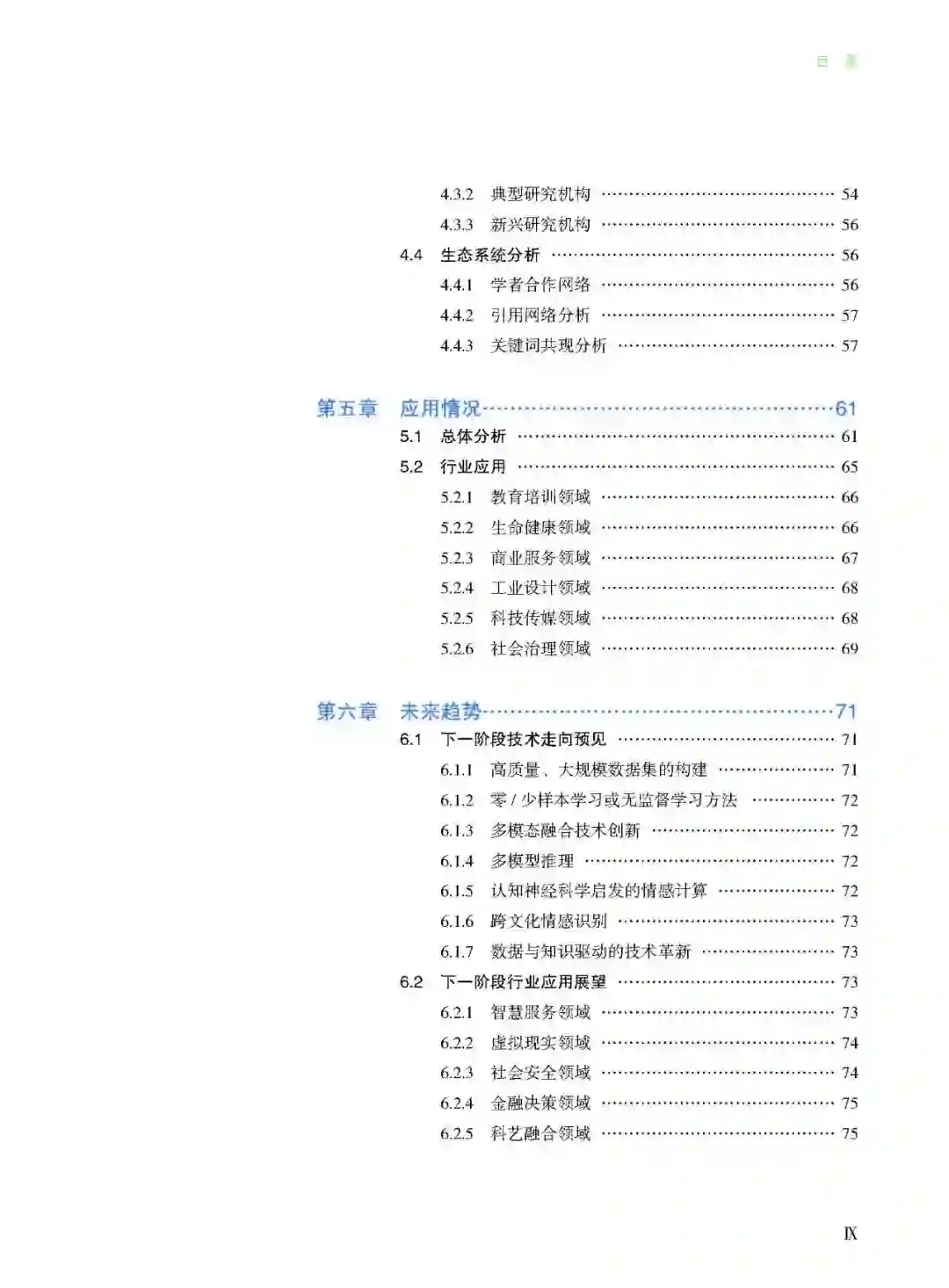 基于数据及文本分析结果,《白皮书》提出了情感计算下一阶段技术走向趋势预测。高质量、大规模数据集的构建、零/少样本学习或无监督学习方法、多模态融合技术创新、多模型推理、认知神经科学启发的情感计算、跨文化情感识别、数据与知识驱动的技术革新,这六大方向将是下一阶段技术发展的趋势。