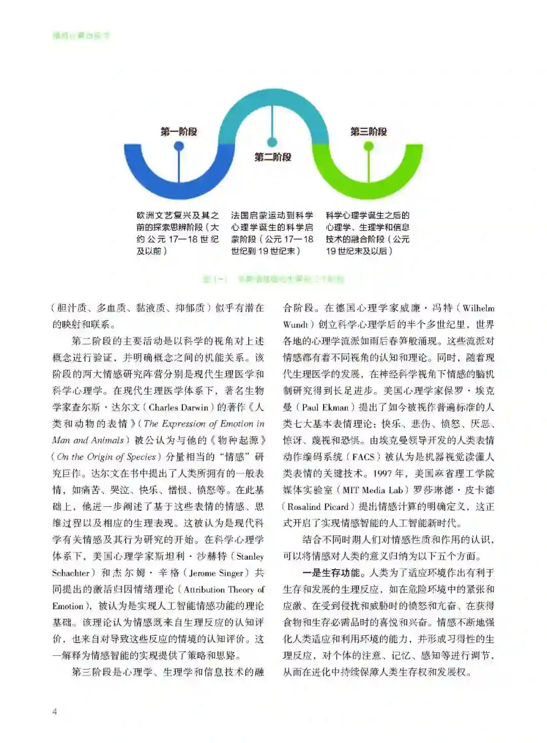 情感计算是一个多学科交叉的研究领域,涉及 计算机科学、脑与心理科学、社会科学等学科。计 算机科学与机电科学侧重于提供各类信息技术手段 和工程化能力,能够对情感的感知、识别、理解、 反馈等实施数字化重构和计算实现,从而使机器能 够拥有类人情感心智功能。脑与心理科学的心理及 意识领域侧重于提供关于人类情感的基础定义、相 关要素结构存在的意义等方面的理论,这为情感理 论建模构筑了基石;脑与心理科学的另一分支—— 认知神经科学则侧重于研究人类大脑对情感加工 的机理以及建立与情感相关的心理要素功能网络, 这为开发情感计算模型提供了关键的启发和策略 的指导。社会科学和医学为情感计算的应用提供 了充分的“用武之地”,是该类技术应用场景设计 的策源地。 由此可见,情感计算是一个多学科共建的领 域,也是一个由行业实际需求推动技术进步和迭代 的领域。