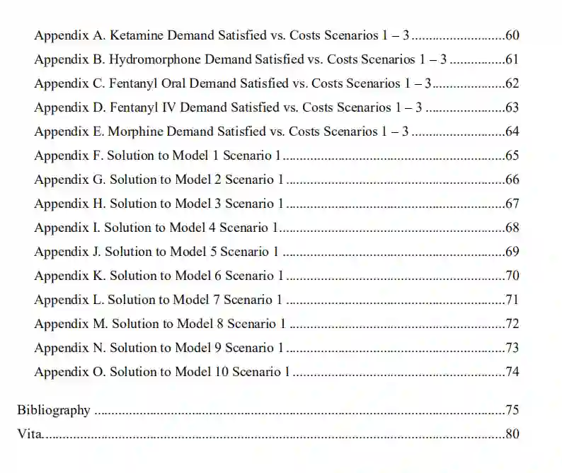 这项研究具体考察了五种院前镇痛药物的供应链管理:氯胺酮、吗啡、芬太尼静脉注射(IV)、芬太尼口服液和氢吗啡酮。通过最近两项涵盖中东地区战斗护理的研究,本论文预测了需求并将其建立在网络中。为了说明供应链的有效性,本研究着眼于朝鲜地区的潜在冲突。通过三种不同的战时情景和十种不同的投入,本研究考察了30个模型和投入对这些情景的影响。