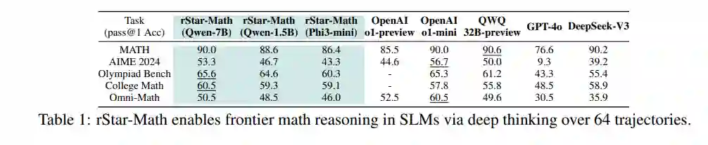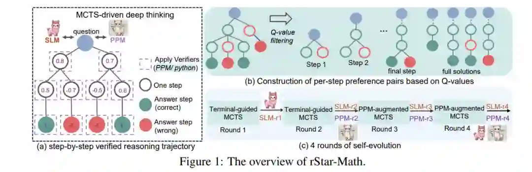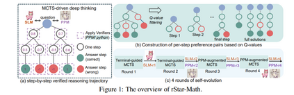 我们介绍了rStar-Math,旨在展示小型语言模型(SLMs)能够与OpenAI的o1模型竞争,甚至超越其数学推理能力,且无需通过优越模型进行蒸馏。rStar-Math通过运用“深度思维”结合蒙特卡罗树搜索(MCTS)实现这一目标,其中数学策略SLM在测试时通过基于SLM的过程奖励模型进行搜索指导。rStar-Math提出了三项创新,以解决训练这两个SLM面临的挑战: 1. 一种新颖的代码增强链式思维(CoT)数据合成方法,该方法通过广泛的MCTS展开生成逐步验证的推理轨迹,用于训练策略SLM; 1. 一种新型的过程奖励模型训练方法,避免了简单的逐步评分注释,从而生成更有效的过程偏好模型(PPM); 1. 一种自我进化的策略,其中策略SLM和PPM从零开始构建,并通过迭代演化来提升推理能力。