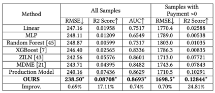 直观来看,把用户更满意的商品推荐给用户应该就可以激励用户付出更多的时间或者支出。然而,模型的上线对于现有的业务方来说是一个很严肃的事情,只有达到业务方的指标,才会被允许进行在线测试。但是如何在离线状态下评估模型是否有潜力使得平台获得更多收益是一个非常有挑战的事。因为用户的具体付费行为受到多种难以观测到的因素的影响。不过我们在这项研究工作中并没有针对这个研究任务展开更多的探索。我们最终仍然基于目前业务上使用的评估手段对模型的有效性进行评估。