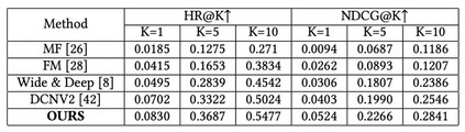 在模型评估阶段,针对测试集中任意用户与待推荐游戏的交互记录(,),首先获取该交互记录对应的负样本集合,然后通过多个训练后的候选的内容推荐模型计算用户对产生交互的游戏的感兴趣程度,以及用户对负样本集合中每个负样本的感兴趣程度,并将所有获得的感兴趣程度进行排序。然后,借助指标k的命中率(Hit Rate at k,HR@K)和归一化折损累计增益(Normalized Discounted Cumulative Gain at k,NDCG@K)评估用户真实交互的产品对应的感兴趣程度是否排在靠前的位置,从而可以借助最终的评价指标HR@K和NDCG@K对应的数值对训练得到的训练后的多个候选的内容推荐模型的有效性进行评估。