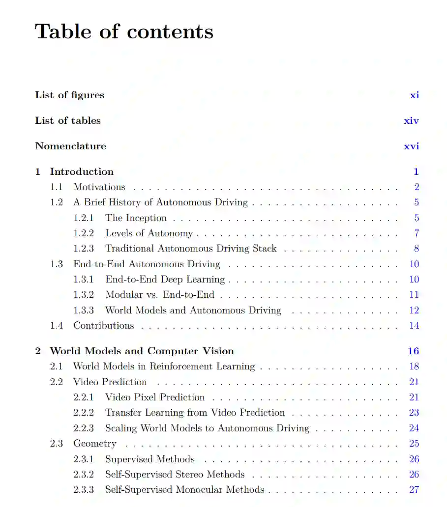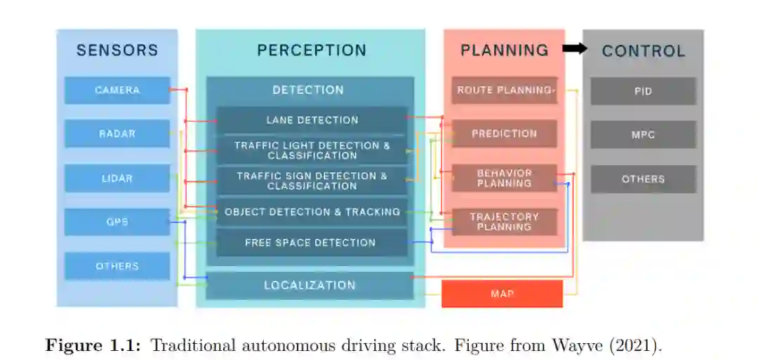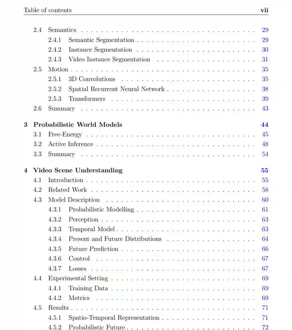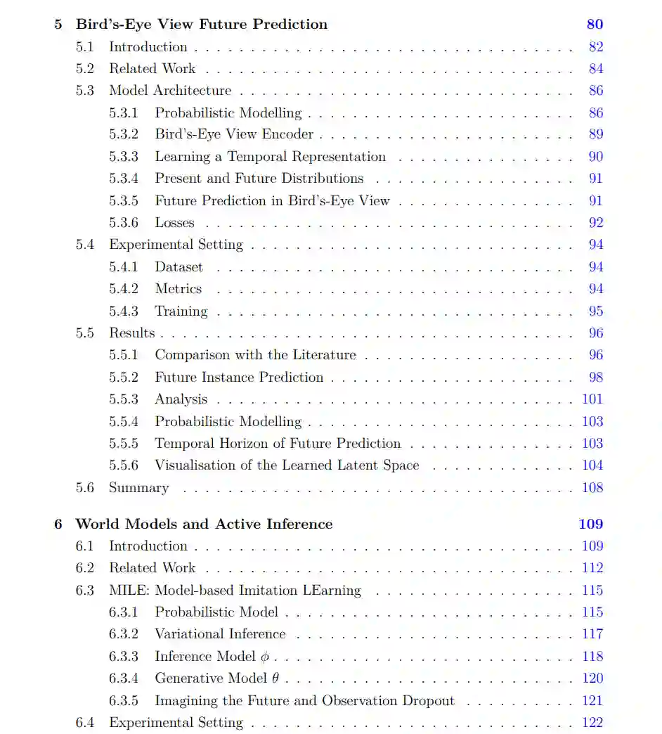 **人类通过被动观察和主动互动来学习世界的心理模型,从而在环境中导航。他们的世界模型允许他们预测接下来可能发生的事情,并根据潜在的目标采取相应的行动。**这样的世界模型在自动驾驶等复杂环境的规划方面具有强大的前景。人类司机或自动驾驶系统用眼睛或相机感知周围环境。他们推断出世界的一种内部表示应该:(i)具有空间记忆(例如遮挡),(ii)填充部分可观测或有噪声的输入(例如被阳光蒙蔽时),以及(iii)能够概率地推理不可观测的事件(例如预测不同的可能的未来)。它们是具身的智能体,可以通过其世界模型在物理世界中预测、计划和行动。本文提出一个通用框架,从摄像机观察和专家演示中训练世界模型和策略,由深度神经网络参数化。利用几何、语义和运动等重要的计算机视觉概念,将世界模型扩展到复杂的城市驾驶场景。**在我们的框架中,我们推导了这种主动推理设置的概率模型,其目标是推断解释主动代理的观察和行动的潜在动力学。**我们通过确保模型预测准确的重建以及合理的操作和过渡来优化日志证据的下界。首先,我们提出了一个模型,预测计算机视觉中的重要量:深度、语义分割和光流。然后,我们使用三维几何作为归纳偏差在鸟瞰空间中操作。我们首次提出了一个模型,可以从360◦环绕单目摄像机鸟瞰动态代理的概率未来轨迹。最后,我们展示了在闭环驾驶中学习世界模型的好处。我们的模型可以联合预测城市驾驶环境中的静态场景、动态场景和自我行为。我们表明,学习世界模型和驾驶策略可以生成超过1小时的预测(比训练序列大小长2000倍)。