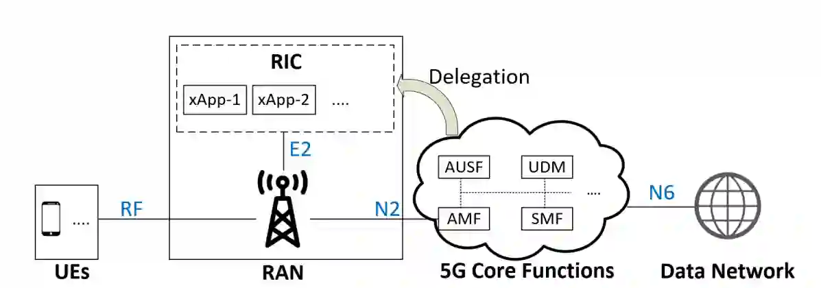 图 2.1. 核心-RAN 决策概念。当需要允许 UE 连接和访问指定资源时,RAN 中定制设计的 xApp 将代表核心决策功能行事。