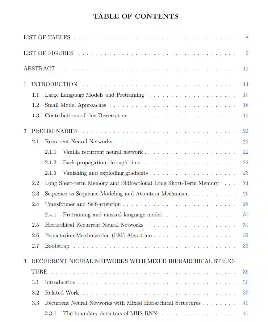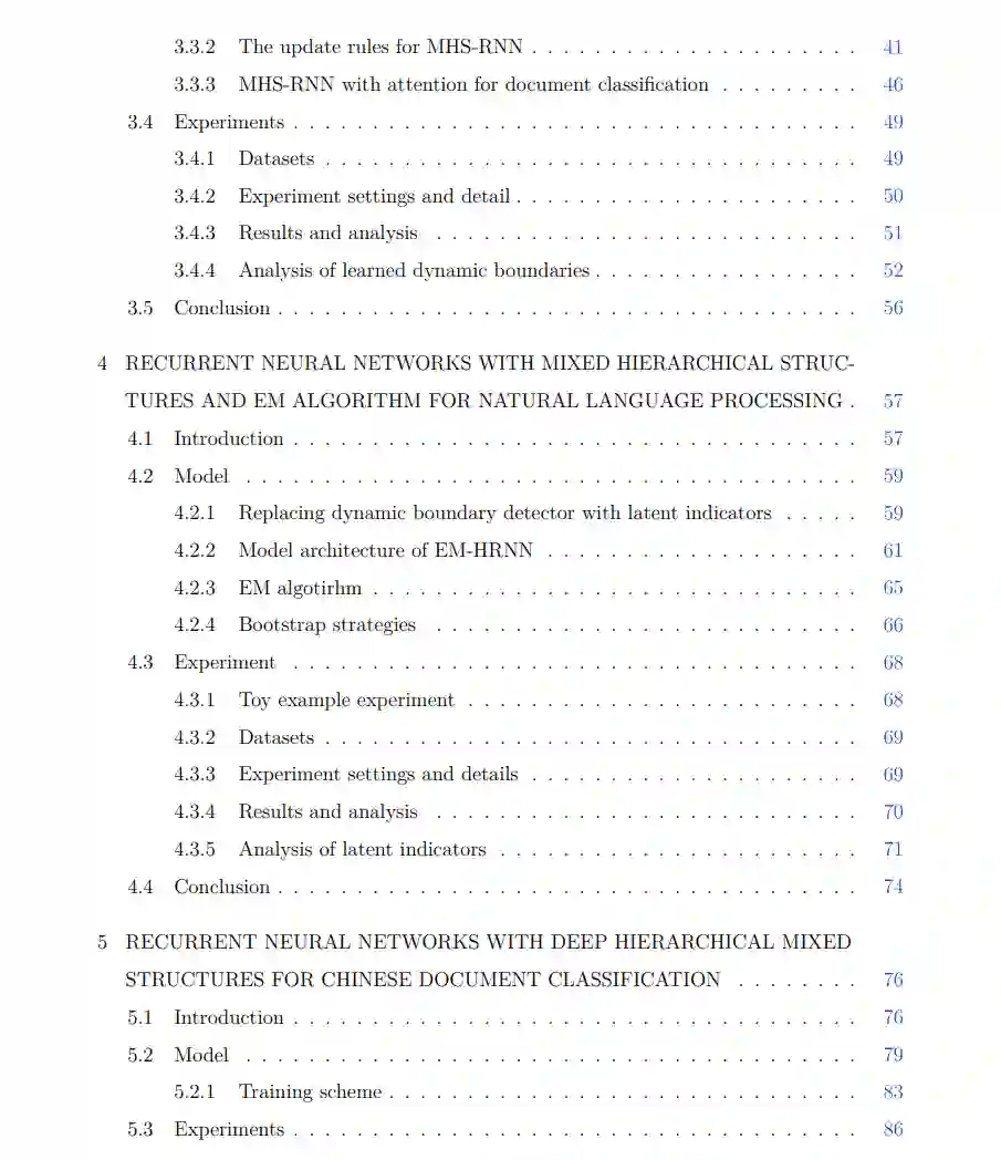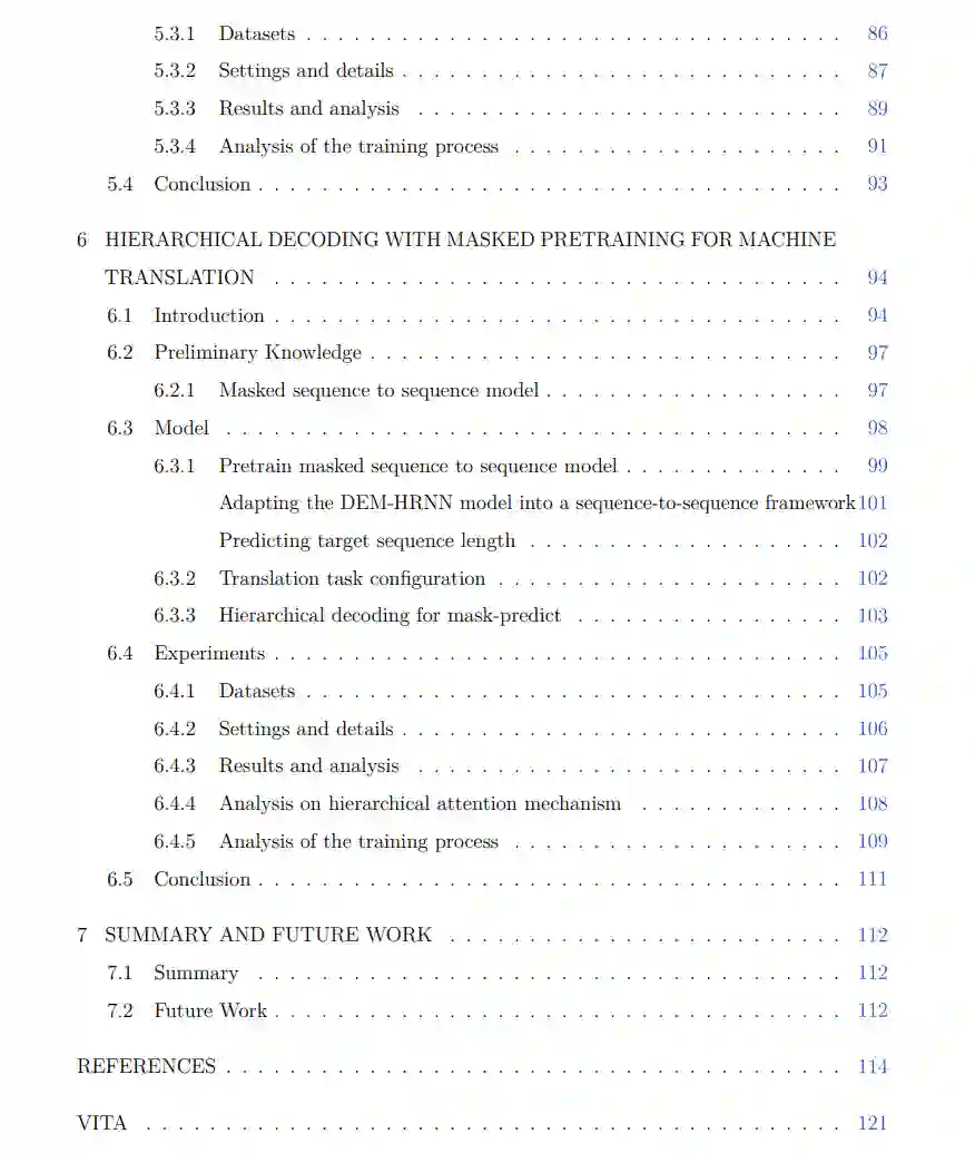 为了解决计算复杂性并优化潜在指标,我们提出了各种统计训练方法。我们进一步研究了如何将模型扩展到一个序列到序列的模型,并提供了一个预训练模型的实用方法和一个层次解码方法,以增强其在文本生成任务(如翻译)中的性能。 具体来说,我们的方法包括以下步骤:首先,我们区分显式和隐式的层次信息,并通过使用多尺度RNN和层次注意机制创建一个纳入这两种信息的层次RNN模型。其次,为了进一步改进模型,我们通过期望最大化(EM)算法整合潜在指标,使用Bootstrap抽样方法减少计算复杂性,并实施分层训练以进行更深层次的RNN。第三,我们将层次语言模型扩展到翻译任务的层次序列到序列模型。为了克服在生成过程中潜在指标的不稳定性,我们使用遮罩训练来预训练序列到序列模型,并提议一个结合遮罩预测和层次信息的层次解码方法。