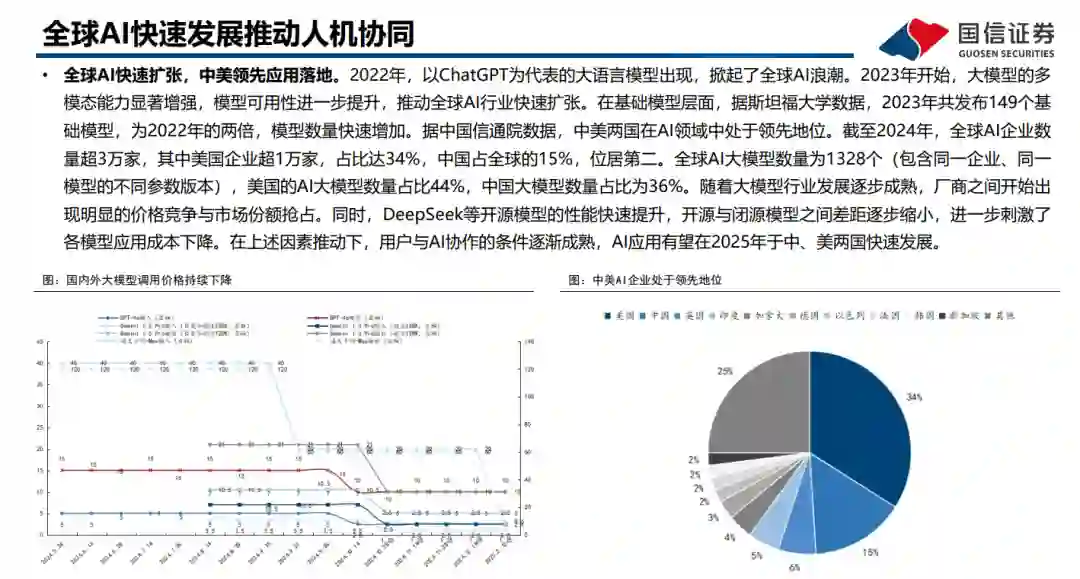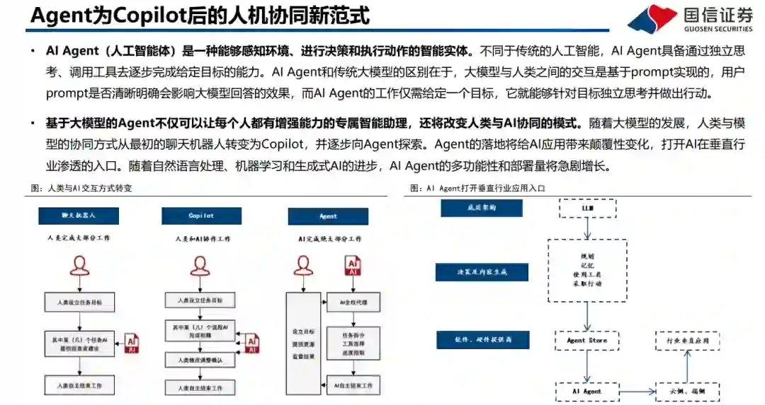 AI Agent是人机交互新范式。AI Agent是能够感知环境、进行决策、执行动作的智能体,在2023已顺应大模型浪潮而生,随着多模态等技术逐步成熟,当前各厂商持续推出相关产品,Agent已开始逐步进入各个场景的工作流中,成为人机协同新范式。根据Roots Analysis预测数据,预计24年全球AI Agent市场规模为52.9亿美金,预计2035年达到2168亿美金,对应24-35年CAGR为40.15%。 OpenAI推出Operator,AI正式迈入Agent时代。Operator由CUA新模型提供支持,其通过强化学习实现了GPT-4o的视觉能力与高级推理相结合,可以像人类一样完成与图形用户界面(GUI)的交互。Operator运行在浏览器中,在云端构建虚拟环境来执行操作,工作步骤主要分为感知、推理、执行。当前Operator测试数据优于前期SOTA,但与人类差距仍较大,目前仍在快速进步中。 Operator遵守严格的数据使用和法律要求。OpenAI在数据使用上,除了公开和用户提供的信息之外,还有较多的第三方公司合作。美国法律对OpenAI在数据访问的隐私保护、数据安全、版权、特定领域数据保护等均有要求,Operator也提供了较为严格的安全措施。 Operator在多个场景应用已逐步显示潜力。Operator的一些典型应用场景包括:旅行预订、购物、餐厅预订、行政任务、市场营销、与 各行业合作。OpenAI正与DoorDash、Instacart、OpenTable和Priceline等公司合作,以改进Operator在现实世界中的应用。 中国团队推出全球首个通用AI Agent Manus,性能表现优异,与阿里千万达到合作。Manus定位为全球第一款通用Agen,面对各类复杂多变的任务,Manus在自己的虚拟环境中灵活调用各类工具——编写并执行代码、智能浏览网页、操作各类网页应用——目标为用户直接交付完整的任务成果。在官方演示中,Manus展现了其筛选简历、遴选房产、股票分析等多种应用场景。在GAIA基准测试中,Manus在所有三个难度级别上都取得了新的最先进(SOTA)表现。目前Manus平台宣布将与阿里通义千问团队正式达成战略合作。