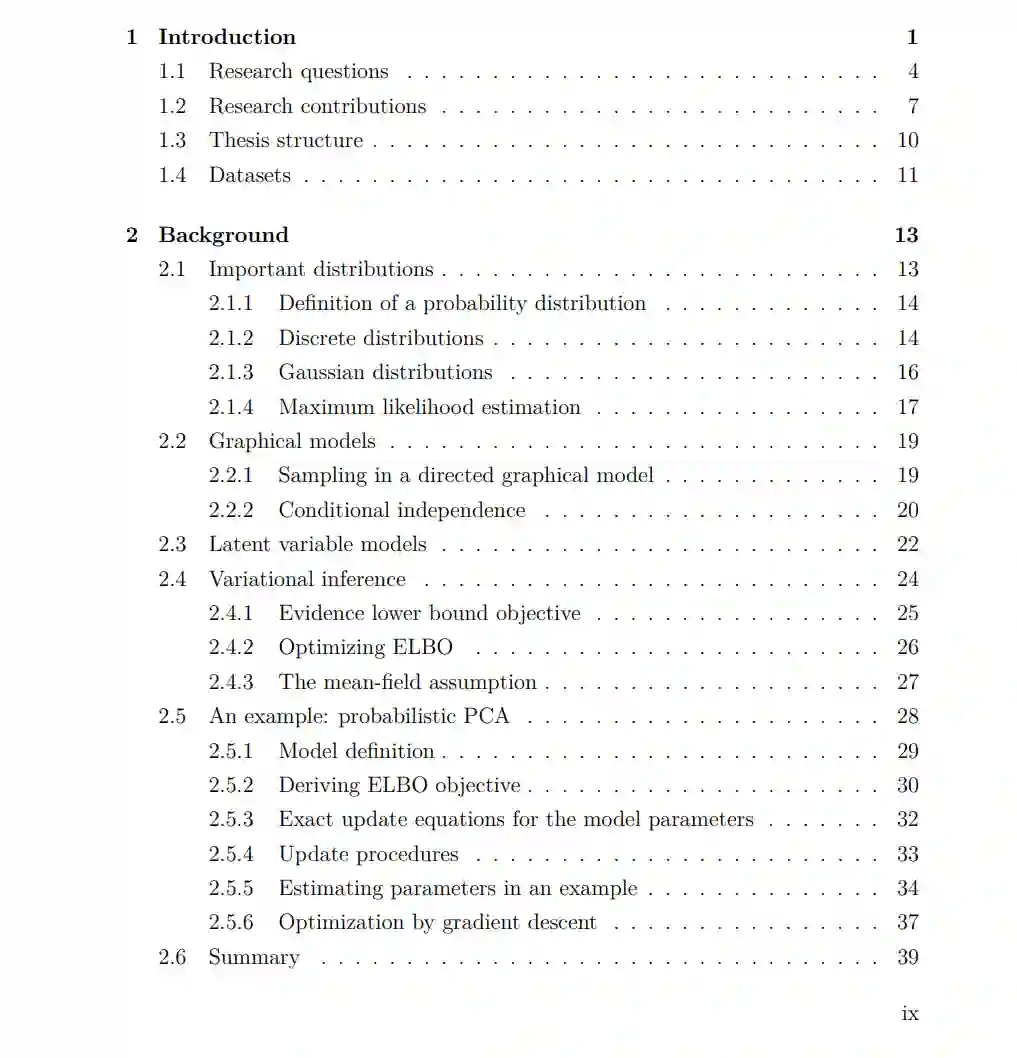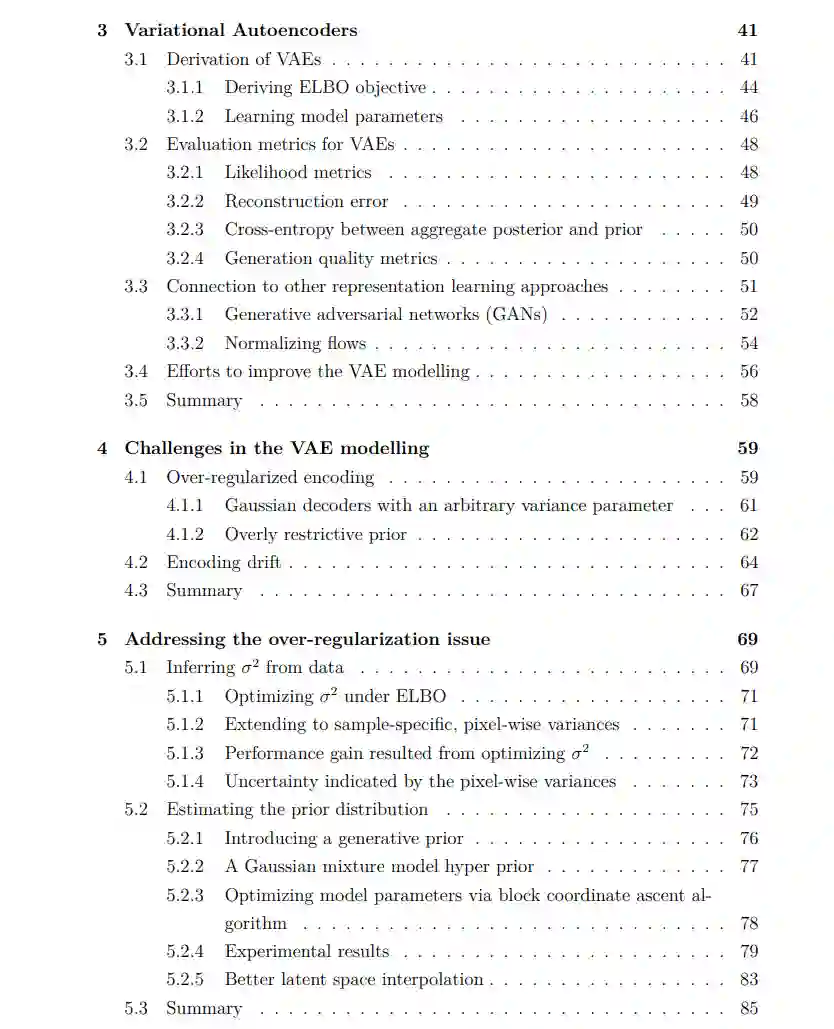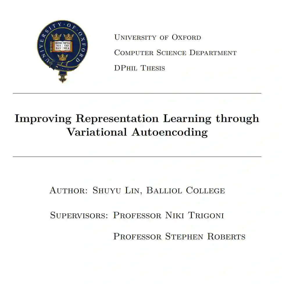 表示学习旨在从原始数据中提炼有用的知识,并将这些知识应用于广泛的应用场景。这种不仅对选定任务有用,而且能推广到新环境的信息提取能力是实现人工智能的关键一步。在这篇论文中,我们关注通过一种特定类型的生成模型得到的表示,即变分自编码器(VAEs)。VAEs具有几个理想的属性。得益于使用变分推理和高斯后验的便捷模型假设以及简单的先验,VAEs通常易于训练并表现出快速收敛。概率建模方法使得VAEs能够从原始数据中得到平滑的潜在表示(即,语义相似的数据样本可能会被映射到潜在空间的相邻区域)。VAEs将原始数据压缩到一个更低维度的潜在空间。与原始数据相比,使用低维表示可以显著降低内存和计算成本。凭借这些优势,VAEs已广泛应用于许多应用领域,包括机器人技术[1]、药物发现[2]和数字内容创作[3]。尽管VAEs已经广泛应用,但进一步提高VAEs的生成建模仍然是一个活跃的研究课题。在这篇论文中,我们关注VAE训练中的两个挑战:1) 在具有高斯解码器和简单先验模型的VAEs中,经常会遇到过度正则化的后验分布;2) 自编码函数可能导致严重的信息漂移,并在连续编码过程中改变原始数据中的信息。针对这两种现象,我们提出了解决方案。具体来说,我们优化高斯解码器中的方差参数,以平衡ELBO目标中的竞争损失项。我们采用一个灵活的先验模型,该模型在潜在空间中实现为一个VAE,以减轻过度正则化的影响。为了减少信息漂移,我们建议修改ELBO目标,加入一个一致性损失,以惩罚这种漂移。我们证明了这些提议可以有效解决之前确定的挑战,并提高VAEs的似然得分。除了与改进VAEs相关的贡献外,我们还展示了VAEs在两个重要机器学习应用中表示学习的能力。首先,我们展示了VAE压缩复杂高维数据的能力是实现异常检测良好性能的关键。我们设计了一个VAE-LSTM异常检测系统,可以准确地识别时间序列中的异常效果。其次,我们展示了结合VAE模块的分类器可以给出更好的校准预测。这是因为VAEs能够在后验分布的扩散中表达相似数据样本之间的不确定性,以及识别出分布样本的能力。