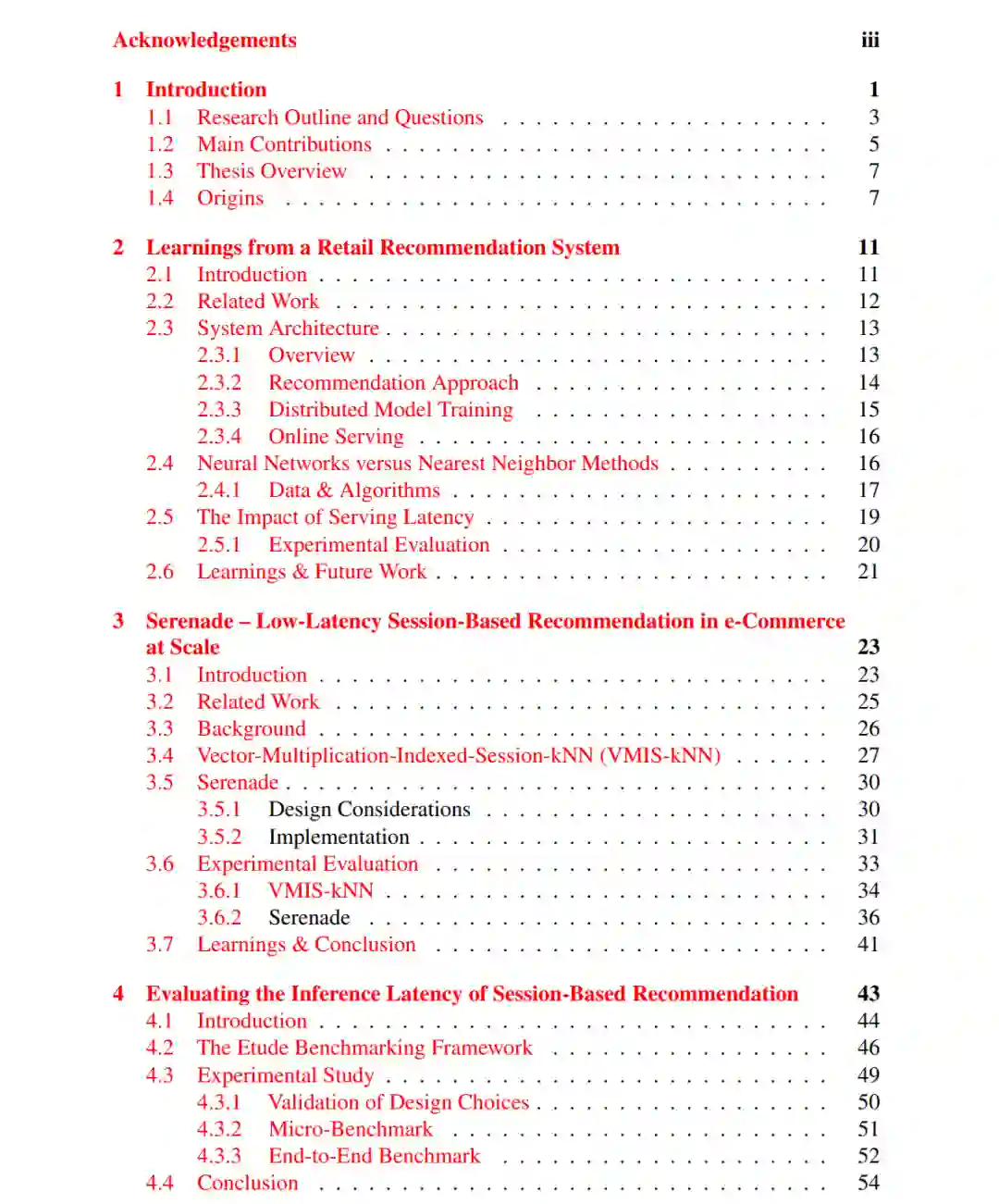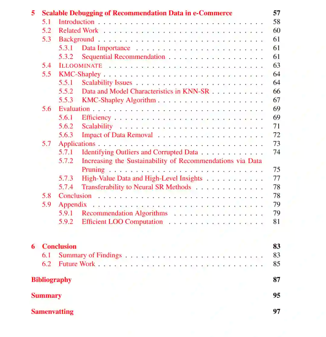 本论文全面探讨了可扩展的会话式推荐系统解决方案,聚焦于以下关键挑战:海量商品目录、数百万用户、稀疏的交互数据,以及大规模推荐数据集的调试问题。本研究与欧洲电商平台 Bol 合作开展,旨在弥合学术前沿成果与工业系统实际需求之间的鸿沟。 第2章聚焦于高效处理数十亿交互数据的算法与框架的设计与部署,这些方案兼具高效性与低延迟特性。相关算法和框架通过离线实验与真实环境部署进行了严格评估。 第3章引入了 VMIS-kNN,这是当前先进方法 VS-kNN 的改进版本。该方法在时间复杂度上更为高效,并通过预构建索引等小型优化措施提升了可扩展性与响应速度,使得推荐计算能够在毫秒级内完成。在六个数据集和多种编程语言实现上的实证评估展示了其有效性。此外,论文还提出了 Serenade——一个面向生产环境的有状态推荐系统,具备高吞吐量与低延迟,能够无缝集成至大规模电商平台中,显著提升了用户参与度等关键业务指标。 第4章重点介绍了 Etude 框架,它为基于神经网络的会话推荐模型在不同部署场景下的推理性能评估提供了一种系统化方法。 第5章则提出了 KMC-Shapley,这是一种面向序列型 kNN 推荐系统的数据 Shapley 值可扩展估计方法。该技术结合算法严谨性与实用性,有效提升了对大规模推荐数据集的调试能力。研究强调了预测性能、系统效率与生态可持续性之间的平衡至关重要。 研究结果验证了邻近算法在特定电商场景下的有效性、系统延迟对用户接受度的关键影响,以及数据价值评估技术在保障基于 kNN 的推荐系统完整性中的作用。本论文开发的开源工具与方法不仅推动了该领域的研究前沿,同时为产业界提供了具有实践价值的参考。通过将理论创新与实际应用相结合,本研究为会话式推荐系统领域作出了重要贡献。