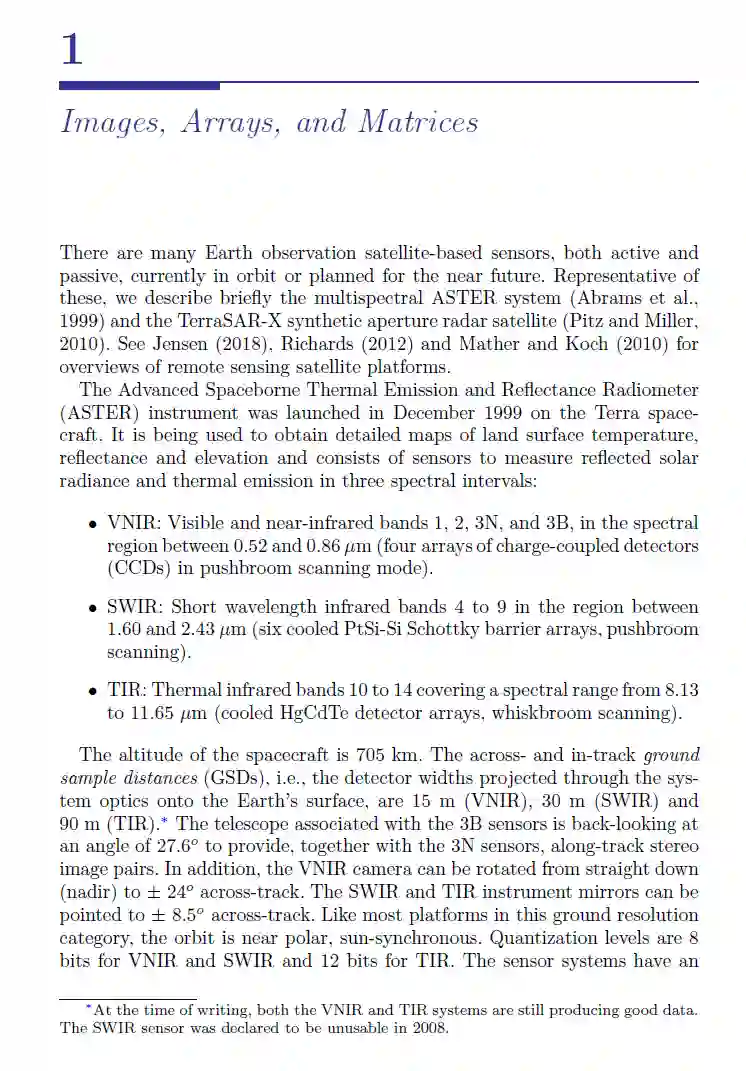 遥感图像分析、分类和变化检测:With Algorithms for Python,第4版,专注于开发和实现统计驱动的、数据驱动的技术,用于遥感图像的数字图像分析,它的特点是算法的统计和机器学习理论与计算机代码紧密交织。它开发了用于光学/红外和合成孔径雷达(SAR)图像分析的统计方法,包括小波变换、非线性分类的核方法,以及前馈神经网络背景下的深度学习介绍。
