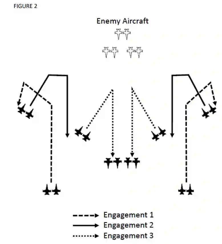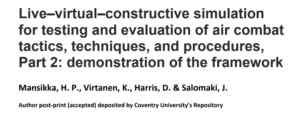 本文展示了本研究第一部分讨论的 L-V-C 模拟框架的实施。在空战 TTP 的测试与评估 (T&E) 中演示了该框架的实施。TTP 由描述飞机飞行员如何协调行动以实现空战目标的规则组成。在演示中,TTP 规则分别在 C、V 和 L 模拟阶段反复制定。在 C 阶段,在不考虑人机交互(HMI)中人类行为影响的情况下,确定与飞机存活概率(Ps)和击落概率(Pk)相关的最优规则。在 V 阶段,通过评估 Pk 和 Ps 的适用性,以及有关飞行员态势感知、心理工作量和 TTP 规则遵守情况的人机交互措施,对最佳规则进行修改。在 L 阶段,使用 F/A-18 飞机和合格的战斗机飞行员来评估在 C 和 L 阶段开发的 TTP 是否能在真实环境中实现可接受的 Pk、Ps 和 HMI 测量。