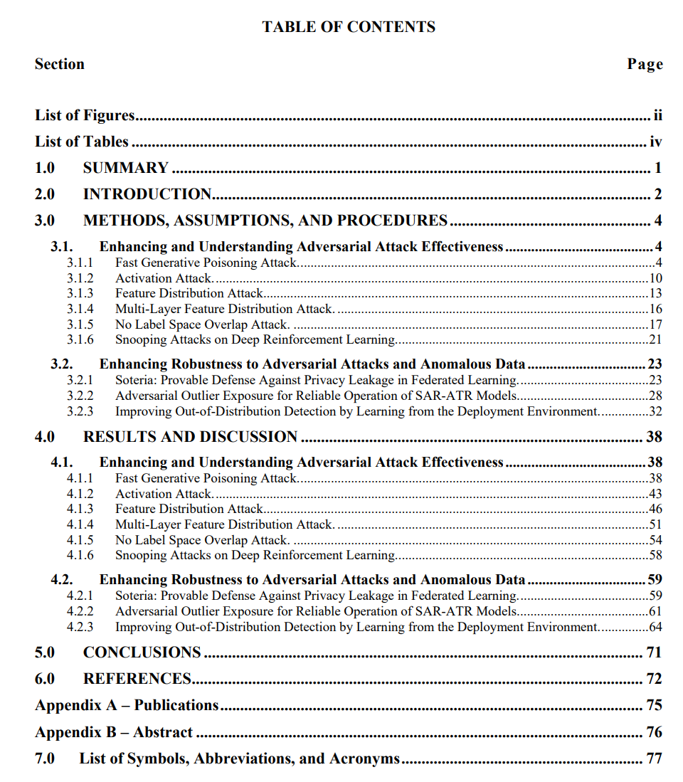 我们第二个研究方向的目标是直接增强DNN的稳健性。正如我们在第一条线中所详述的,目前对抗性攻击对基于DNN的系统构成了重大风险。在我们足够信任这些模型并将其整合到我们最信任的系统(如防御技术)之前,我们必须确保我们考虑到所有可行的数据损坏和变异形式。在第3.2.1节中,我们考虑的第一种情况是在分布式学习环境中制定一个针对数据反转攻击的原则性防御。之后,在第3.2.2节中,我们极大地提高了自动目标识别(ATR)模型在开放环境中运行的准确性和稳健性,因为我们不能保证传入的数据将包含训练分布中的类别。在第3.2.3节中,我们更进一步,开发了一种内存受限的在线学习算法,通过利用部署环境中的样本,增强了开放世界环境中ATR模型的稳健性。同样,这些工作的实验、结果和讨论都包含在第4.0节的相应部分。