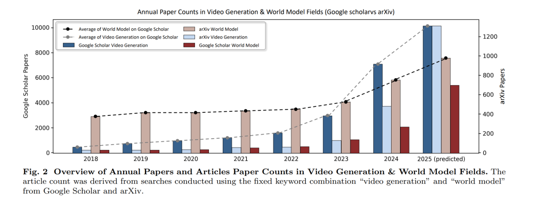 世界模型(World Models)旨在模拟真实世界,这一目标长期以来一直是人工智能领域的重要挑战,对机器人、自动驾驶和游戏等多种应用产生了深远影响。虽然构建世界模型所需的具体能力尚未被精确定义,但诸如 三维生成(3D generation) [1–3]、三维/四维场景生成(3D/4D scene generation) 以及 视频生成(video generation) 等研究方向,均展现出与世界建模相关的一项或多项关键能力,例如:运动动力学(motion dynamics)、交互性与可控性(interaction and controllability)、视觉质量(visual quality)、三维一致性(3D consistency)以及生成效率(generation efficiency)。因此,这些方向被视为通往世界模型的重要潜在路径。 尽管各类方法在世界建模的部分能力上各有优势,但视频生成提供了一条更直接且全面的途径,有望成为构建世界模型的有力工具。从认知科学角度看,视觉是人类及具身智能体(embodied agents)感知、学习与推理世界的主导感知通道。视觉流不仅传递空间结构与物体属性,还编码时间动态与因果关系,这些信息对于预测与规划至关重要。即便是复杂的 3D 或 4D 模拟,也可以以视频或图像的形式进行渲染与理解,这意味着人类与智能体均依赖视觉序列来建立对世界的理解。这种对视觉表征的内在依赖,使视频生成成为构建世界模型的天然且信息丰富的基础。 近年来,端到端视频生成的重大进展表明,这类模型已能充当高质量的视觉渲染器,从而支持以视频为核心的世界建模探索。随着扩散模型(diffusion models) [4–7] 与 自回归Transformer(autoregressive transformers) [8–10] 技术的突破,生成具备基础世界知识的高保真视频已成为可能。基于这些主干的当前方法 [11–27] 已能生成长时序、高质量的视频,在视觉层面具备高度真实感,从而能够高保真地模拟现实环境并融合多模态条件信号。因此,将视频生成模型视为世界模型的趋势日益显著。 在本综述中,我们将物理世界模型(physical world model)定义为一种复杂的数字引擎,它编码全面的世界知识,以符合物理与数学规律的方式模拟真实世界动态。此类模型既可作为推动机器人、自动驾驶和游戏等领域发展的高保真仿真器,也可作为受控的实验环境,用于在真实但安全的条件下训练和评估智能体。此外,通过建模物理世界,它们还能支持基于物理的工程、关键决策及其他现实任务。 近期的视频生成突破 [11–13, 15, 17, 18, 21–37],源于扩散模型 [38–47]、自回归骨干网络 [48]、变分自编码器(VAE) [49, 50]、图像生成技术 [35, 51–59]、可控图像生成 [60, 61]、以及训练与推理效率提升 [62–72] 的进步;再加上更灵活的条件注入模块 [73, 74] 与视频渲染 [75] 的增强,共同标志着该领域的关键转折点。这些模型如今能够生成植根于世界知识的高质量视频,并开始在构建世界模型中扮演核心角色。同时,随着虚拟现实(VR)具身智能(Embodied AI)等技术的快速发展,将世界模型集成至交互式、实时环境中已愈发可行。这些技术趋势与视频生成方法的成熟共同表明,我们正处于一个新时代的门槛上——世界模型将成为塑造自主系统、智能体与沉浸式虚拟环境的核心基础。这一趋势在图2中得到进一步印证:自2018年以来,尽管“世界模型”话题在论文中时有出现,但其发表数量较为平稳;而自2024年起,视频生成在技术突破与相关研究数量上均出现爆发式增长,从而催生了新一轮的世界模型研究热潮。这一模式凸显了视频生成与世界建模之间的共演关系(co-evolution):视频生成的快速进展不仅是平行发展,而是世界模型演化的关键驱动因素。因此,现在正是系统性探讨从视频生成到世界建模演进的最佳时机。 尽管取得了显著进展,但在概念层面结构层面仍存在诸多挑战。概念上,“世界模型”的定义仍较模糊,难以统一视角并有效衡量进展;结构上,领域中缺乏完善的能力分类体系,用以组织建模能力、发展阶段及潜在演化路径。因此,迫切需要系统化的阐释与综述性研究,以整合已有成果并指引未来方向。当前的综述工作 [76–88] 已在方法、数据集与应用层面打下基础,但仍亟需明确哪些方面已被充分探索,哪些领域(如实时集成、可控的视频到世界生成管线、综合评估指标等)仍相对空白。基于此,本综述旨在描绘从视频生成迈向全面世界建模的清晰路线,为未来研究与开发提供方向指导。 本文首先给出形式化定义,并围绕世界模型的分类体系(taxonomy)展开详细讨论。我们将物理世界模型定义为一种嵌入全面世界知识的数字仿真引擎,能够基于环境状态与上下文先验预测下一个场景。每一步预测可表示为三元组:(当前场景 Current Scene, 导航模式 Navigation Mode, 先验信息 Prior Information)(\text{当前场景 Current Scene},\ \text{导航模式 Navigation Mode},\ \text{先验信息 Prior Information})(当前场景 Current Scene, 导航模式 Navigation Mode, 先验信息 Prior Information) 三者共同决定了模拟环境的演化。模型重点捕捉物理环境的因果与时空动态,而外部输入(如导航模式或动作)则作为扰动信号影响环境演化。因此,世界模型可视为一个交互式环境系统(interactive environment system),它响应外部干预,但不显式建模产生这些干预的决策过程。基于此定义,我们系统分析了视频生成模型向世界建模演化的历程,并提出按模型能力划分的四代分类体系(如图1所示): * 第一代:真实性(Faithfulness)——准确模拟真实世界; * 第二代:交互性(Interactiveness)——具