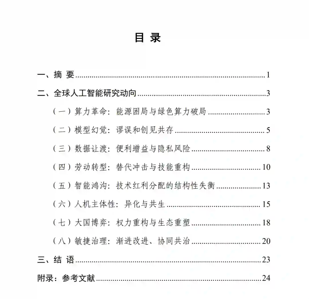 随着生成式人工智能的爆发性演进,技术创新已实现由实验室向社会的全面渗透。当大模型从判别式迈向通用式,当算法从辅助工具演化为自主决策系统,技术已超越工具理性范畴,成为塑造经济秩序、权力结构与文明形态的元力量。进入 2025 年,人工智能的社会化应用呈现出深度赋能和系统性风险并存的双重图景。一方面,人工智能作为新质生产力的核心引擎,驱动产业智能化升级,孵化出一系列新业态、新场景、新模式,在医疗、教育、新闻、科研等领域释放出巨大潜力。另一方面,数据泄露、算法偏见、隐私侵犯、劳动替代、情感依赖、环境污染等问题,不断挑战社会伦理底线与全球治理体系韧性。在此背景下,上海市人工智能与社会发展研究会推出《全球人工智能社会发展研究报告(2025)》,立足于技术演进和社会发展的双重逻辑,系统梳理近两年人工智能领域国内外前沿研究成果,综合研判全球人工智能最新研究动态,致力于构建具有前瞻性的研究范式与方法论体系,为后续研究提供可能的思路与方向。报告基于学术前瞻性和社会关切度的双重考量,遵循技术本体-社会辐射-治理反馈的逻辑链路,选取了社会科学领域人工智能研究的八大议题:算力变革、模型幻觉、数据让渡、劳动替代、智能鸿沟、大国博弈、人机关系、敏捷治理。报告试图通过深入剖析各议题的前沿进展、核心争议与发展趋势,为政策制定者、研究者及产业界提供兼具理论洞见与实践价值的参考框架。