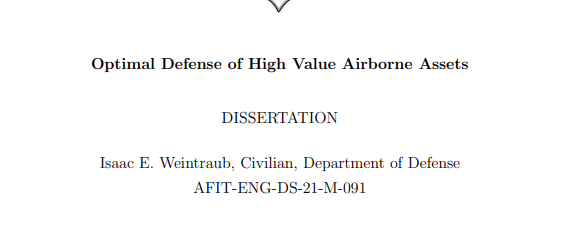 本论文共六章。第一章介绍了解决最优高价值航空资产(HVAA)防御问题的动机,包括研究问题、任务、范围和方法。第二章是多智能体差分博弈的文献综述,重点介绍了与 HVAA 防御相关的工作。第二章还有一节描述了研究空白以及本研究如何解决文献中的空白。第三章介绍了拟议研究中使用的方法和技术,随后介绍了每个研究任务的解决方法。第四章介绍了使用动能武器防御 HVAA 的最佳策略。最后,第六章将总结发言、所做贡献和确定的未来工作。