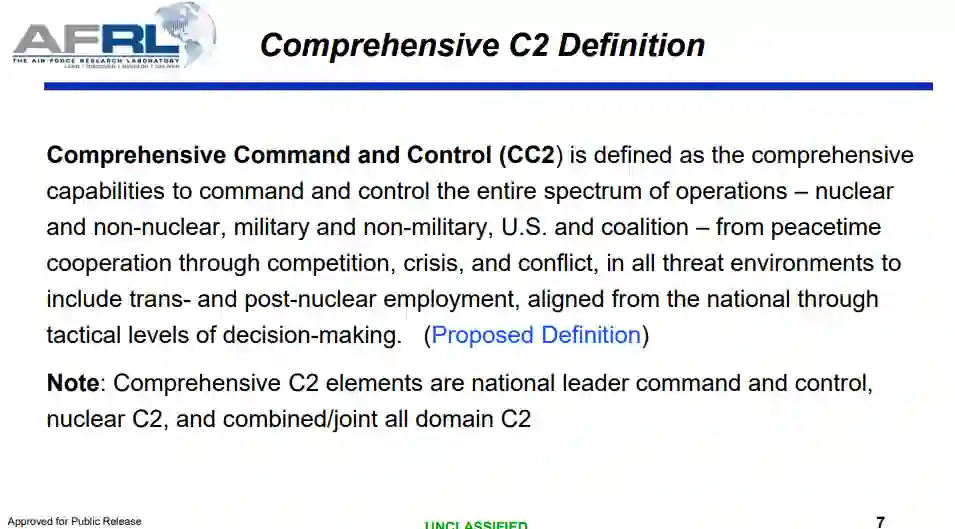 综合指挥与控制(CC2)被定义为指挥和控制整个行动范围的综合能力--核与非核、军事与非军事、美国与联盟--从和平时期的合作到竞争、危机和冲突,在所有威胁环境中,包括跨核和核后使用,从国家决策层到战术层保持一致。(建议的定义) 。注:综合C2要素是指国家领导人的指挥和控制、核C2和联合/共同的所有领域C2。