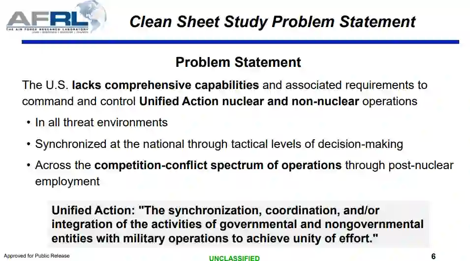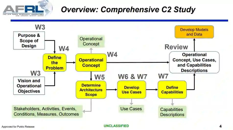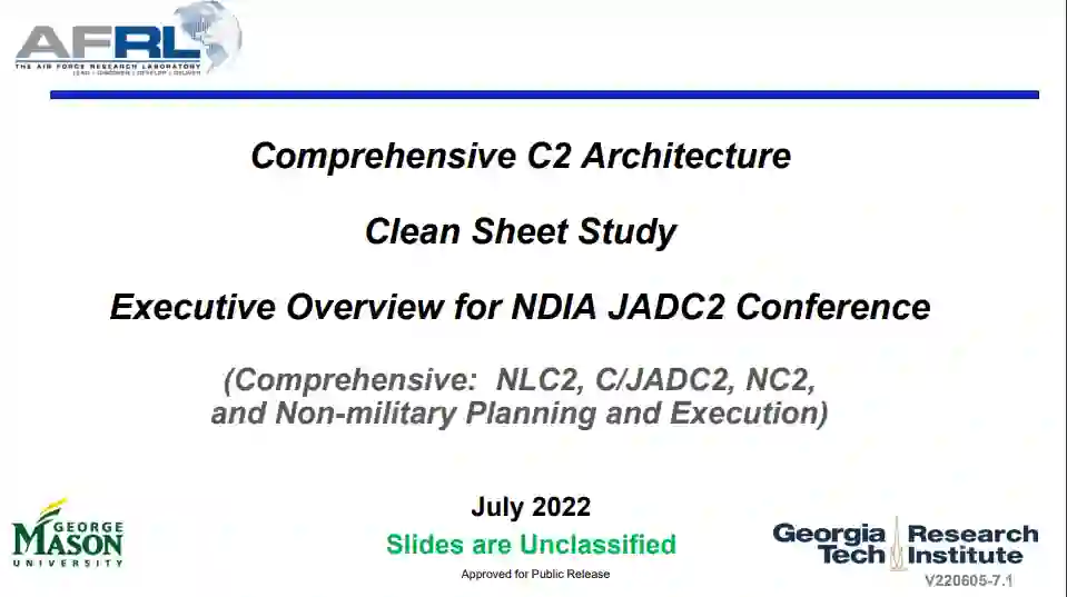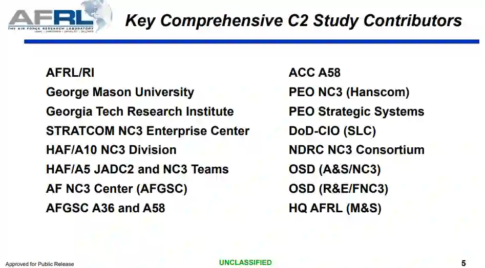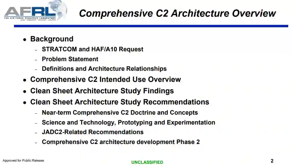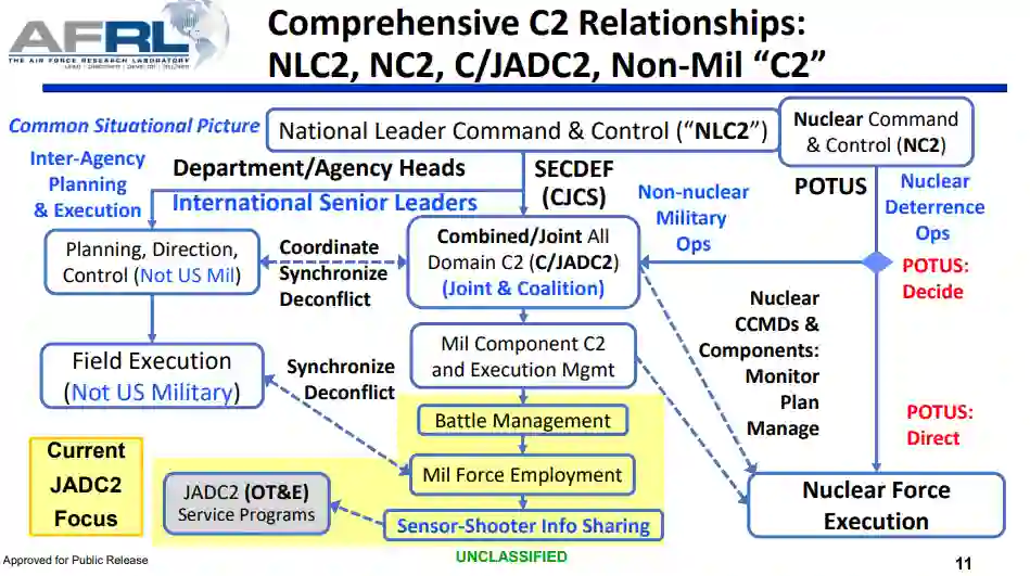 AFRL对其2017年的MD-C2 "Clean Sheet "进行后续研究,以制定一个综合的C/JADC2/C3-NC2/C3概念架构框架,然后以该框架为基础,为联合/全域C2(JADC2)/C3和国家C2/C3(包括核C2/C3)应用提出渐进的技术解决方案(名义上是向适用的ABMS和NC2项目办公室提出)。