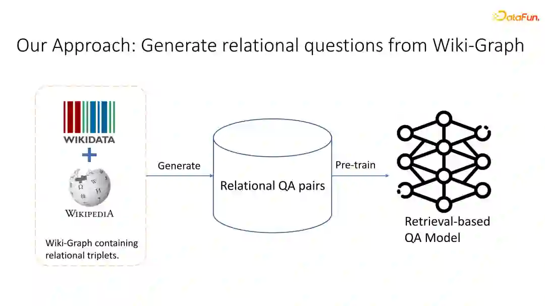 为了解决这一问题,我们自然而然可以想到,既然WIKIDATA知识图谱包含了非常多的关系型数据,那么是否利用它去生成出一些预训练的数据,基于此来预训练一个开放域问答模型,让模型取获取WIKIDATA数据中的各类关系型知识?如果我们能利用这些知识图谱中的知识生成大数据的话,就能让模型掌握更多在test set中可能会出现的一些新的关系的答案。