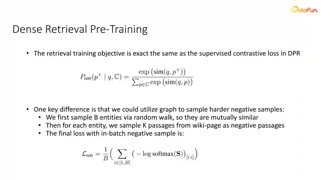 接下来是关于dense retrieval triple的预训练,这部分训练的objective和DPR基本一致,不同在于我们选取负样本时,一个很重要的准则是选取的负样本需要足够难。如果说选取是很随机的负样本,比如说基于一个question,我们随机从WIKIPAGE中选取出来一个句子的话,模型很容易就能判别出来它与question不相干。因此我们希望负样本尽可能和true passage在语义上有一定的相关联度,但同时它又不包含真实的答案。