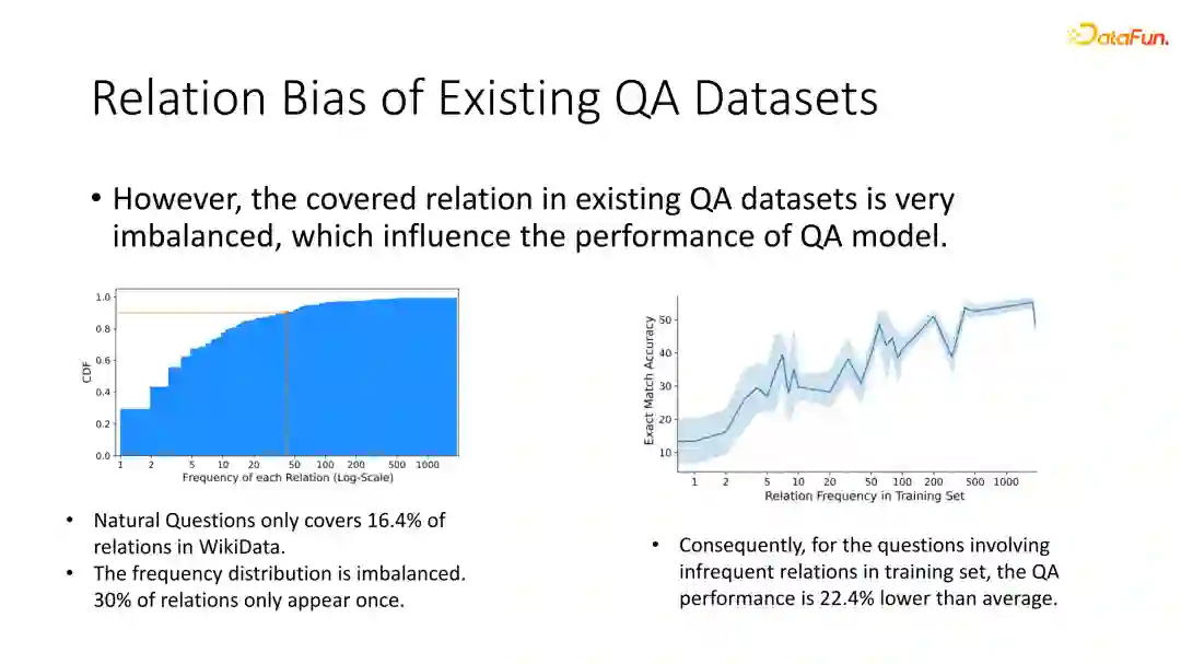 通过分析,我们发现Natural questions数据集中 40% 的open domain questions可以被直接被open data当中的一些条目所回答,说明了让模型充分合理地掌握关系知识对于解决这类开放式问答的重要程度。 然而,现有的数据集关系分布非常不均匀,在Natural questions数据集中只包含了WIKIDATA当中16.4%的关系类别,其余的80%多的relation类别是没有出现在其中的。那么,如果我们想要处理的一些问题包含这些新的relation时,模型很有可能没有办法解决。同时,即使数据已经包含了这些relation,它的relation分布也非常不均衡,其中30%的relation仅出现一次。因此我们也相应分析了最终的结果和relation出现的频率是否有关系。