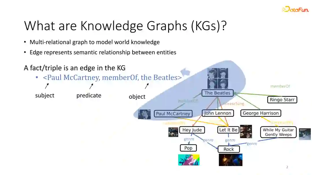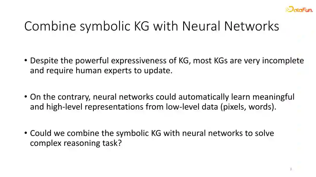 **导读:**知识图谱是一种多关系的图结构,每个节点表示一个实体,每个边表示连接的两个节点之间的关系,可以将图谱中建模的节点和边表示为三元组。知识图谱有很强的符号化表征能力,但是还是会有不完整性,很难直接用于问答系统、语音助手等场景。神经网络可以自动抽取高语义的表征,可以更好地帮助解决各类问题。但是,神经网络缺少可解释性,将神经网络和知识图谱进行结合可以在不需要人工介入的情况下解决一些非常高层次的知识推理工作。 本文主要介绍作者过去一年中做的两个方向的工作:第一类是利用知识图谱中的结构化知识预训练神经网络模型,让这些预训练模型学习这些图谱知识;第二类工作是直接使用可微分神经网络进行复杂的知识图谱的推理工作。本文主要介绍生成式的自监督图神经网络预训练模型和可微分的知识图谱推理两方面的内容。 主要讲解内容包括一下几点: * 什么是知识图谱 * 使用知识图谱中的知识进行神经网络的预训练 * 可微分知识图谱逻辑推理 01****什么是知识图谱