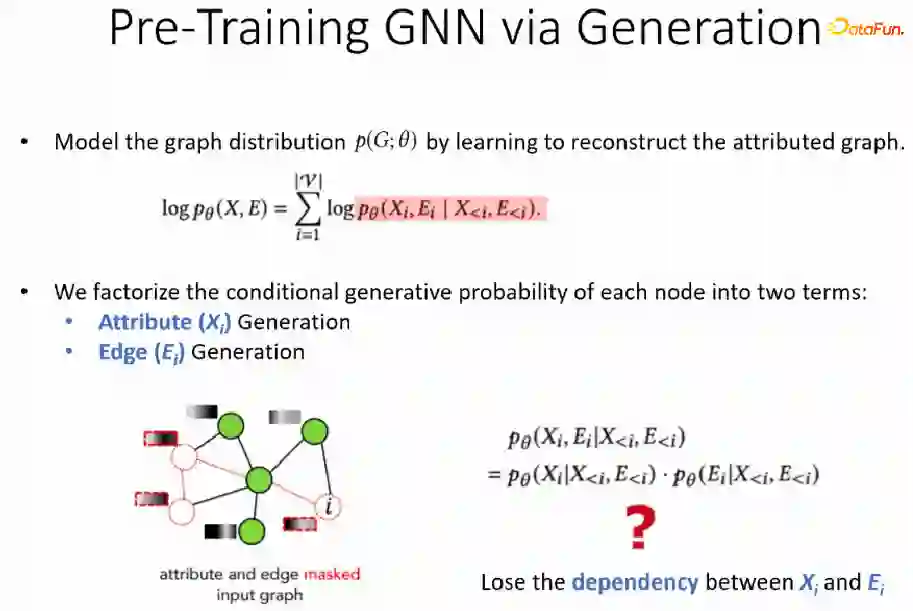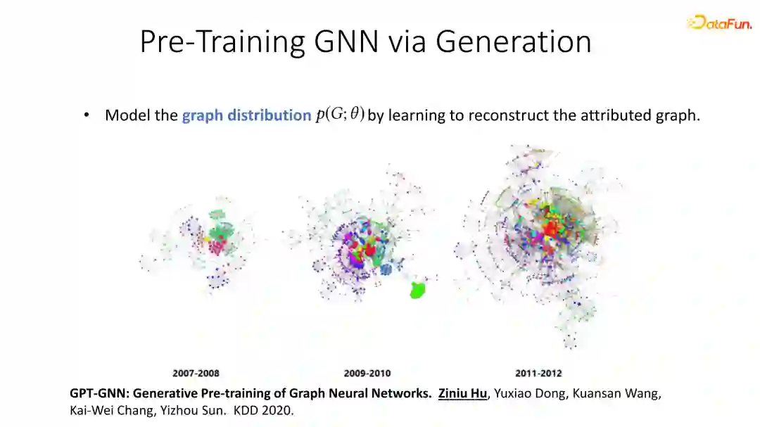有没有一种方法能够使图神经网络不依赖标注数据就能够去捕捉图中的结构化知识?基于这个想法,我们设计了一个重建每一个图的生成式目标,作为自监督信号来训练图神经网络。论文的名称叫Generative Pre-Training of Graph Neural Networks,中文名图神经网络的生成预训练。论文的思想是:如果我们通过预训练使得图神经网络能够掌握图中的一些基础结构信息以及一些规律的话,很多下游任务是非常依赖于图中的结构信息,比如link prediction model.在某种意义上,就算是图结构的一些生成。Community detection某种意义上是找寻这个图当中一些重要的子结构。