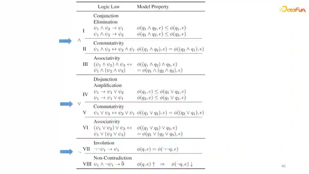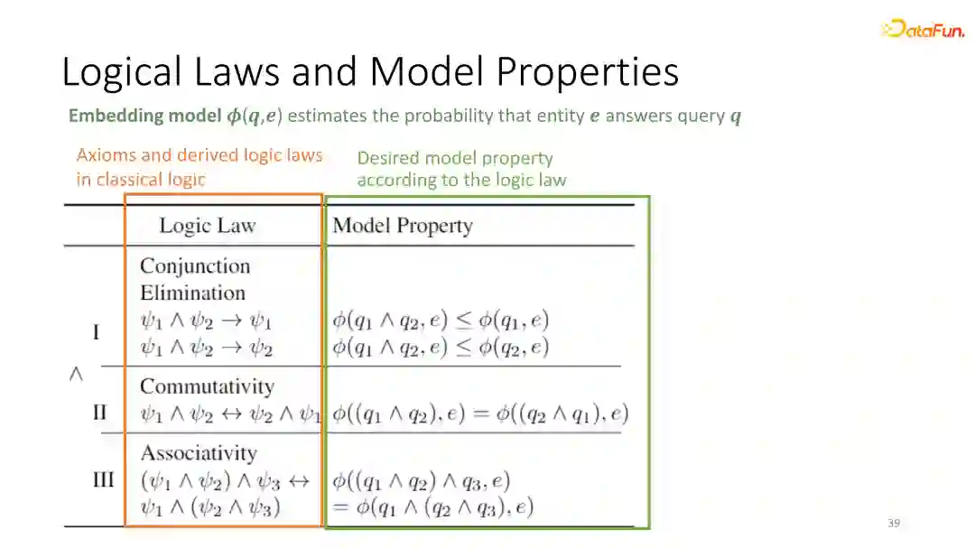这部分我们不多展开,大家感兴趣的可以去看我们paper。简单来说就是我们根据一些logical law最基本的性质总结出了query embedding 需要符合的对应的一些性质。在这里总共有八条性质。