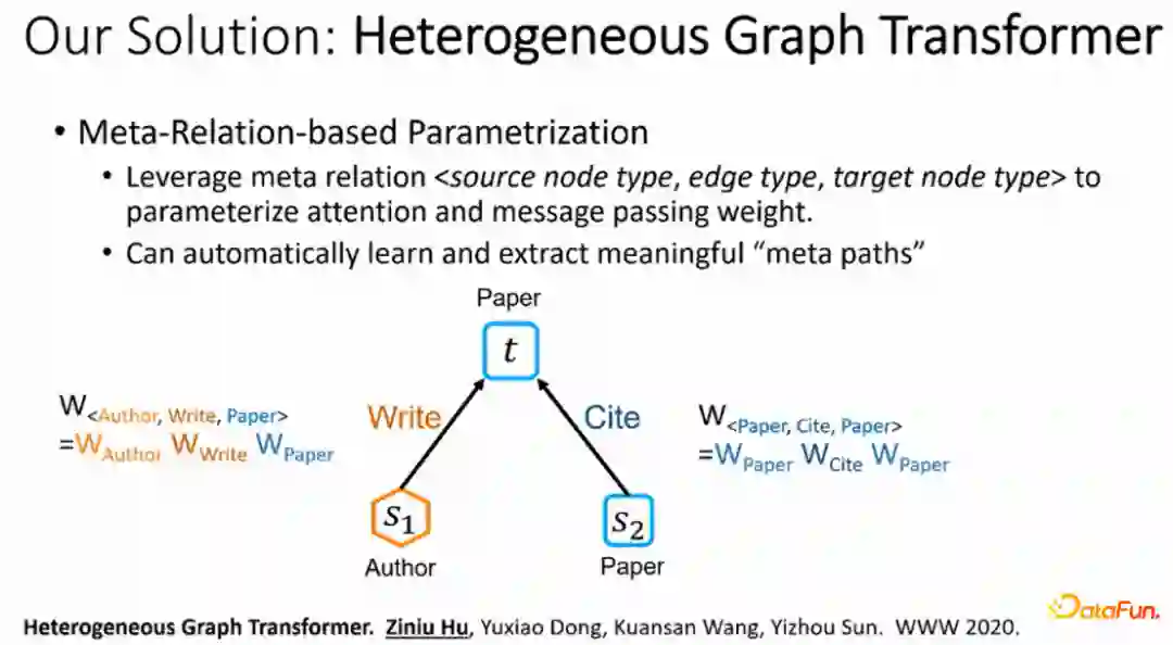 2020年,作者提出了异构图transformer模型(HGT),基本的思想是将异构图中meta relation <source node type, edge type, target node type>信息参数化为每一个从 source node 到 target node 注意力和信息传播权重矩阵,从而隐式地将图中的关系数据注入到模型当中。同时可以利用Transformer的自注意力机制,让每一个节点去选择对它最重要的邻居,自注意力机制在传播时与每个边上面的 meta relation 相关,它就和整体的图中的一些的语义是有关联的,因此除了对结果的提升以外,HGT模型不需要人为的设定就可以对每一个下游任务选取出最重要的meta path。