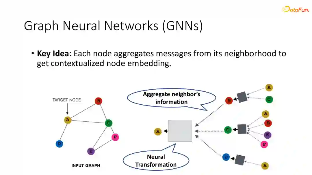图神经网络的核心是将原本独立建模的每一个data point连接起来,考虑它们之间的一些相互之间的依赖关系,使得每对每一个节点聚集来自其邻居的信息,从而使其获得更全局并且符合语境的表征,让模型有能力去捕捉在图中的结构知识。