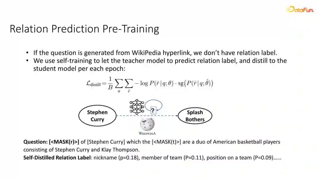 然而,如果说数据是从DPR模型中得到的,那么每一条边其实是一个hyperlink,我们并不知道它真实的relation是什么。对这一类数据我们利用了一个自学习self training的方式进行训练。在每一个epoch周期,我们使用上一轮的模型作为teacher model生成关系标签,并将其作为source label蒸馏到student 模型。
