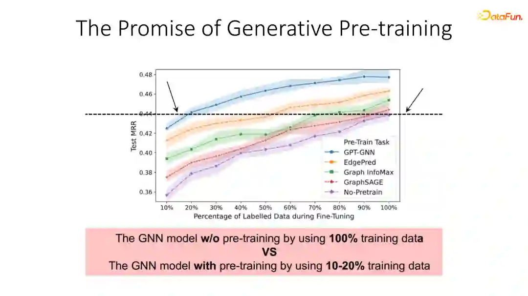 同时GPT-GNN仅需要利用10%到20%的数据上进行fine-tuning都能够取得其他模型在整个数据集上进行fine-tuning一样的效果。这表明通过这种生成式预训练方式,我们的模型可以极大地减少对下游任务标注数据的依赖。这部分代码已经开源换,换一个观看以及使用。