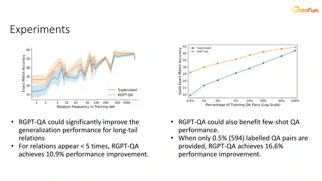 通过这张图我们可以看出,对于一些出现不频繁的,例如只出现一次两次的一些relation对应的一些问题,泛化能力的提升会更加显著,尤其是对于那些出现少于五次的relation对应的问题,我们能够取得超过百分之10.9%的高效提升。同时,和其他预训练工作一样,我们这个模型也能够显著提升少样本问答的性能,从而减少对于每一个task的标注数据的依赖。