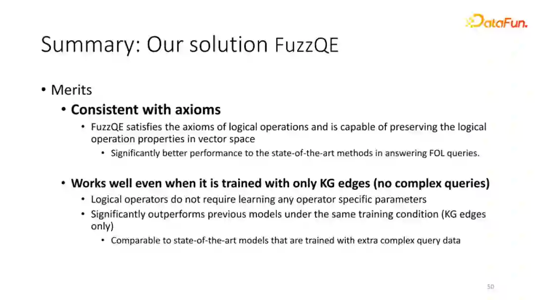 作为总结,我们提出的fuzzQE符合所有最基本的逻辑公理,并可以在没有复杂语句作为训练数据的情况下能取得很好的结果。当然这个工作暂时还是只在knowledge graph上进行推理,我们接下考虑能否将工作运用到真实的QA set去处理一些需要复杂的逻辑推理才能解决的问答数据。